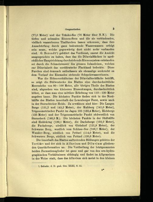 sein muss, welche gegenwärtig dort nicht mehr vorhanden sind. G. Berendt') gebührt das Verdienst, zuerst die Ansicht ausgesprochen zu haben, dass das die Diluvialflächen in nordsüdlicher Hauptrichtung durchziehende Rinnensystem entstanden sei durch die Schmelzwasser des grossen Inlandeises, welches zur Diluvialzeit das norddeutsche Flachland bedeckte. Diese Furchen sind demnach aufzufassen als ehemalige senkrecht zu dem Verlauf des Eisrandes stehende Schmelzwasserrinnen. Was die Höhenverhältnisse der Diluvialhochfläche betrifft, so zeigt die Südwestecke des Blattes eine durchschnittliche Meereshöhe von 80—100 Meter, alle übrigen Theile des Blattes sind, abgesehen von kleineren Einsenkungen, durchschnittlich höher, so dass man eine mittlere Erhebung von 110—120 Meter angeben kann. Die höchsten Punkte finden sich in der Nordhälfte des Blattes innerhalb der Leuenberger Forst, sowie auch in der Sternebecker Heide. Zu erwähnen sind hier: Die Langen Berge(151,2 und 145,2 Meter), der Kuhberg(141,0 Meter), Trigonometrischer Punkt im Jagen 105(133,4 Meter), Eichberge (133 Meter) und der Trigonometrische Punkt südwestlich von Sternebeck(140,5 M.). Die höchsten Punkte in der Südhälfte sind Heidekrug(139,1 Meter), die Dachsberge(132,2 Meter), die Fuchsberge, nördlich von Gielsdorf (121,8 Meter), der Schwarze Berg, westlich vom Schloss-See(106,7 Meter), der Wunder-Berg, nördlich von Prötzel (114,0 Meter), und die Schwarzen Berge, südlich von Prötzel (120,6 Meter).