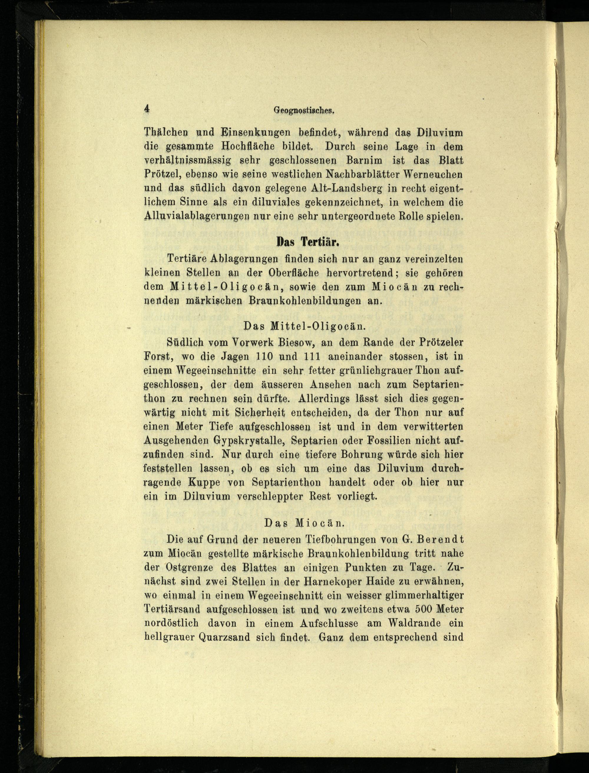 Die auf Grund der neueren Tiefbohrungen von G. Berendt zum Miocän gestellte märkische Braunkohlenbildung tritt nahe der Ostgrenze des Blattes an einigen Punkten zu Tage. Zunächst sind zwei Stellen in der Harnekoper Haide zu erwähnen, wo einmal in einem Wegeeinschnitt ein weisser glimmerhaltiger Tertiärsand aufgeschlossen ist und wo zweitens etwa 500 Meter nordöstlich davon in einem Aufschlusse am Waldrande ein hellgrauer Quarzsand sich findet. Ganz dem entsprechend sind
