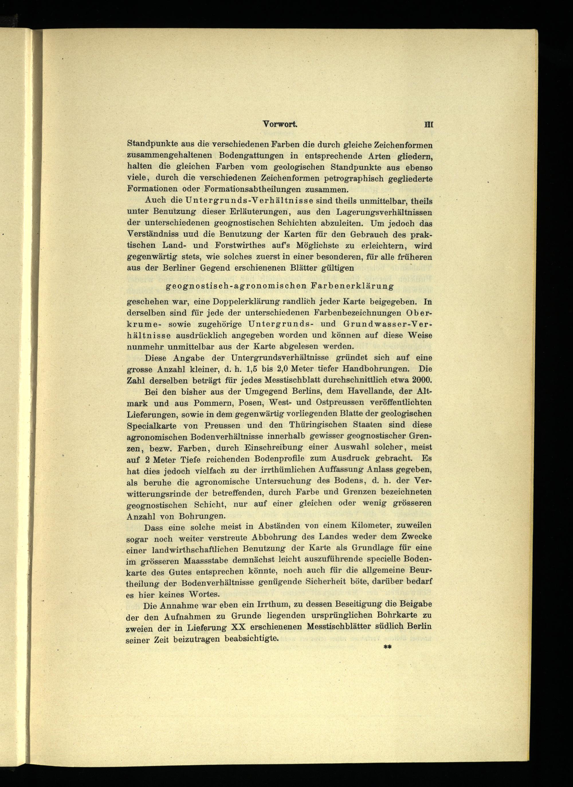 Bei den bisher aus der Umgegend Berlins , dem Havellande, der Altmark und aus Pommern , Posen, West- und Ostpreussen veröffentlichten Lieferungen, sowie in dem gegenwärtig vorliegenden Blatte der geologischen Specialkarte von Preussen und den Thüringischen Staaten sind diese agronomischen Bodenverhältnisse innerhalb gewisser geognostischer Grenzen, bezw. Farben, durch Einschreibung einer Auswahl solcher, meist auf 2 Meter Tiefe reichenden Bodenprofile zum Ausdruck gebracht. Es hat dies jedoch vielfach zu der irrthümlichen Auffassung Anlass gegeben, als beruhe die agronomische Untersuchung des Bodens, d. h. der Verwitterungsrinde der betreffenden, durch Farbe und Grenzen bezeichneten geognostischen Schicht, nur auf einer gleichen oder wenig grösseren Anzahl von Bohrungen.