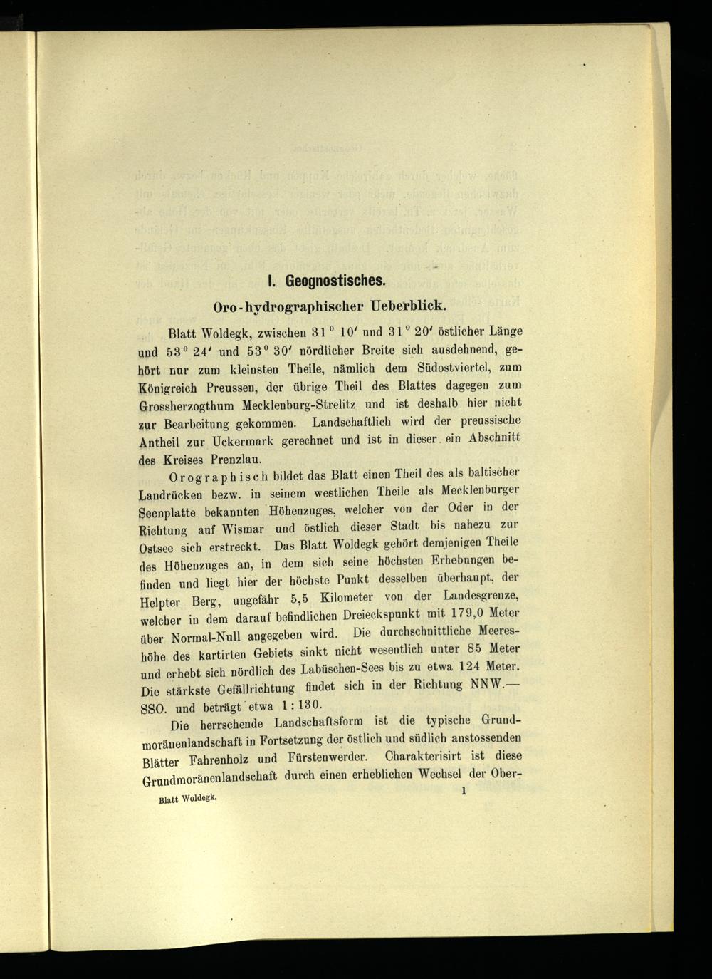 Orographisch bildet das Blatt einen Theil des als baltischer Landrücken bezw. in seinem westlichen Theile als Mecklenburger Seenplatte bekannten’Höhenzuges, welcher von der Oder in der Richtung auf Wismar und östlich dieser Stadt bis nahezu zur Ostsee sich erstreckt. Das Blatt Woldegk gehört demjenigen Theile des Höhenzuges an, in dem sich seine höchsten Erhebungen befinden und liegt hier der höchste Punkt desselben überhaupt, der Helpter Berg, ungefähr 5,5 Kilometer von der Landesgrenze, welcher in dem darauf befindlichen Dreieckspunkt mit 179,0 Meter über. Normal-Null angegeben wird. Die durchschnittliche Meereshöhe des kartirten Gebiets sinkt nicht wesentlich unter 85 Meter und erhebt sich nördlich des Labüschen-Sees bis zu etwa 124 Meter. Die stärkste Gefällrichtung findet sich in der Richtung NNW.— SSO. und beträgt etwa 1: 130.