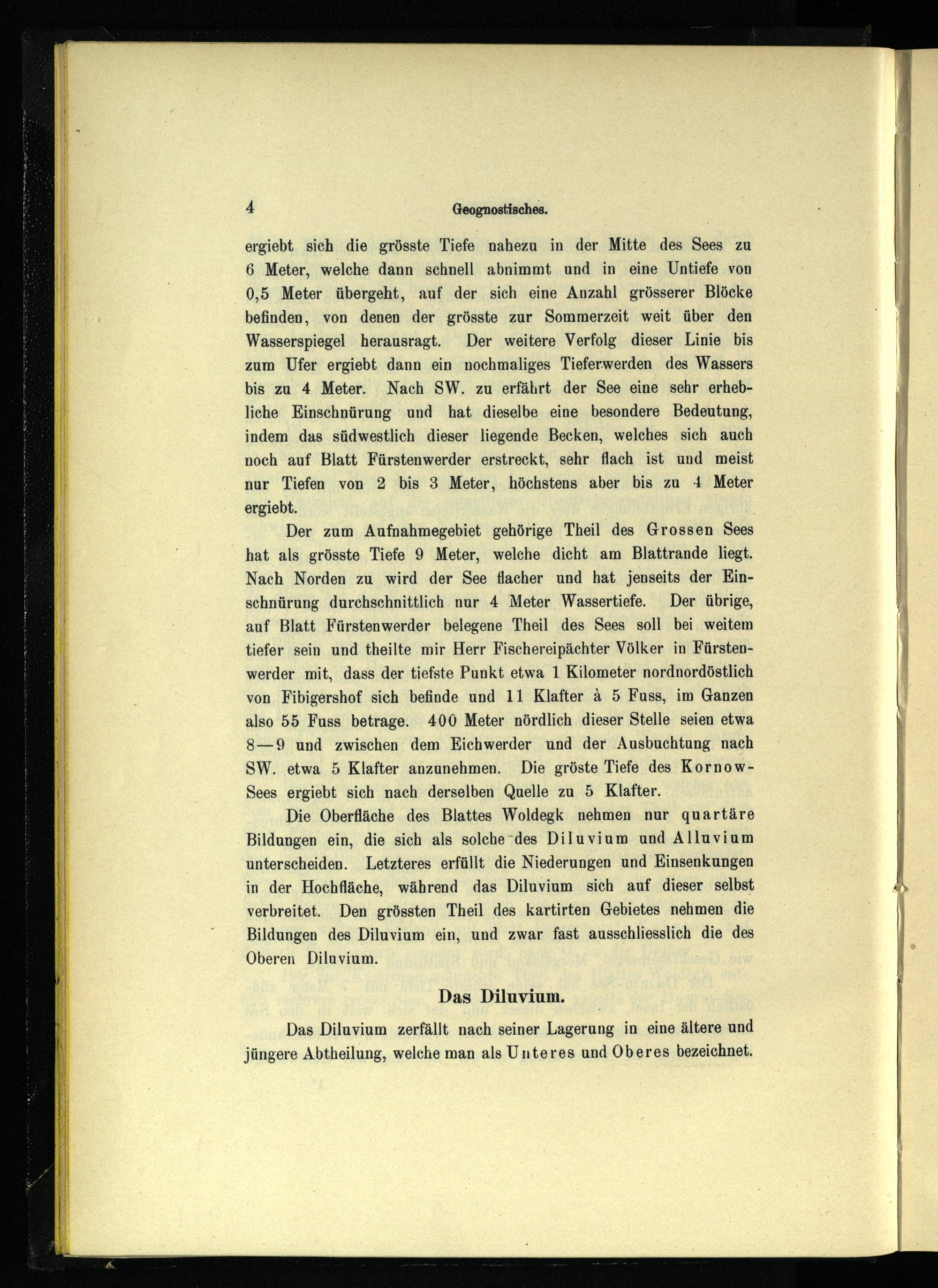 hat als grösste Tiefe 9 Meter, welche dicht am Blattrande liegt. Nach Norden zu wird der See flacher und hat jenseits der Einschnürung durchschnittlich nur 4 Meter Wassertiefe. Der übrige, auf Blatt Fürstenwerder belegene Theil des Sees soll bei weitem tiefer sein und theilte mir Herr Fischereipächter Völker in Fürsten werder mit, dass der tiefste Punkt etwa 1 Kilometer nordnordöstlich von Fibigershof sich befinde und 11 Klafter a 5 Fuss, im Ganzen also 55 Fuss betrage. 400 Meter nördlich dieser Stelle seien etwa 8—9 und zwischen dem Eichwerder und der Ausbuchtung nach SW. etwa 5 Klafter anzunehmen. Die gröste Tiefe des KornowSees ergiebt sich nach derselben Quelle zu 5 Klafter.