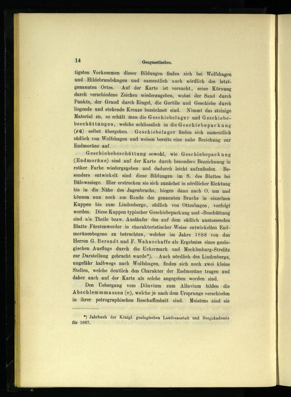 Geschiebebeschüttung sowohl,. wie Geschiebepackung (Endmoräne) sind auf der Karte durch besondere Bezeichnung in rother Farbe wiedergegeben und dadurch leicht aufzufinden. Besonders entwickelt sind diese Bildungen im S. des Blattes bei Bülowssiege . Hier erstrecken sie sich zunächst in nördlicher Richtung bis in die Nähe des Jagenbruchs, biegen dann nach O. um und können nun noch am Rande des genannten Bruchs in- einzelnen Kuppen bis zum Lindenberge, südlich von Ottenhagen, verfolgt werden. Diese Kuppen typischer Geschiebepackung und-Beschüttung sind als Theile bezw. Ausläufer des auf dem südlich anstossenden Blatte Fürstenwerder in charakteristischer Weise entwickelten Endmoränenbogens zu betrachten, welcher im Jahre 1888 von den Herren G. Berendt und F. Wahnschaffe als Ergebniss eines geologischen Ausflugs durch die Uckermark und Mecklenburg-Strelitz zur Darstellung gebracht wurde*).- Auch nördlich des Lindenbergs, ungefähr halbwegs nach Wolfshagen, finden sich noch zwei kleine Stellen, welche deutlich den Charakter der Endmoräne tragen und daher auch auf der Karte als solche angegeben worden sind.