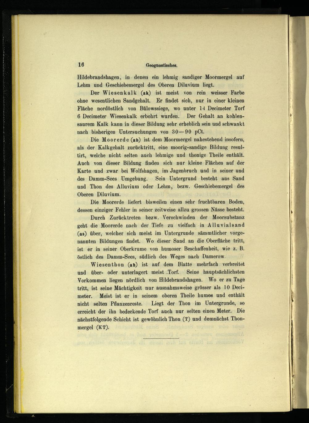 Wiesenthon(an) ist auf dem Blatte mehrfach‘verbreitet und über- oder unterlagert meist„Torf. Seine hauptsächlichsten Vorkommen liegen nördlich von Hildebrandshagen. Wo er zu Tage tritt, ist seine Mächtigkeit nur ausnahmsweise grösser als 10 Decimeter. Meist ist er in seinem oberen Theile humos und enthält nicht selten Pflanzenreste. Liegt der Thon im Untergrunde, so erreicht der ihn bedeckende Torf auch nur selten einen Meter. Die nächstfolgende Schicht ist gewöhnlich Thon(T) und demnächst Thonmergel(KT).