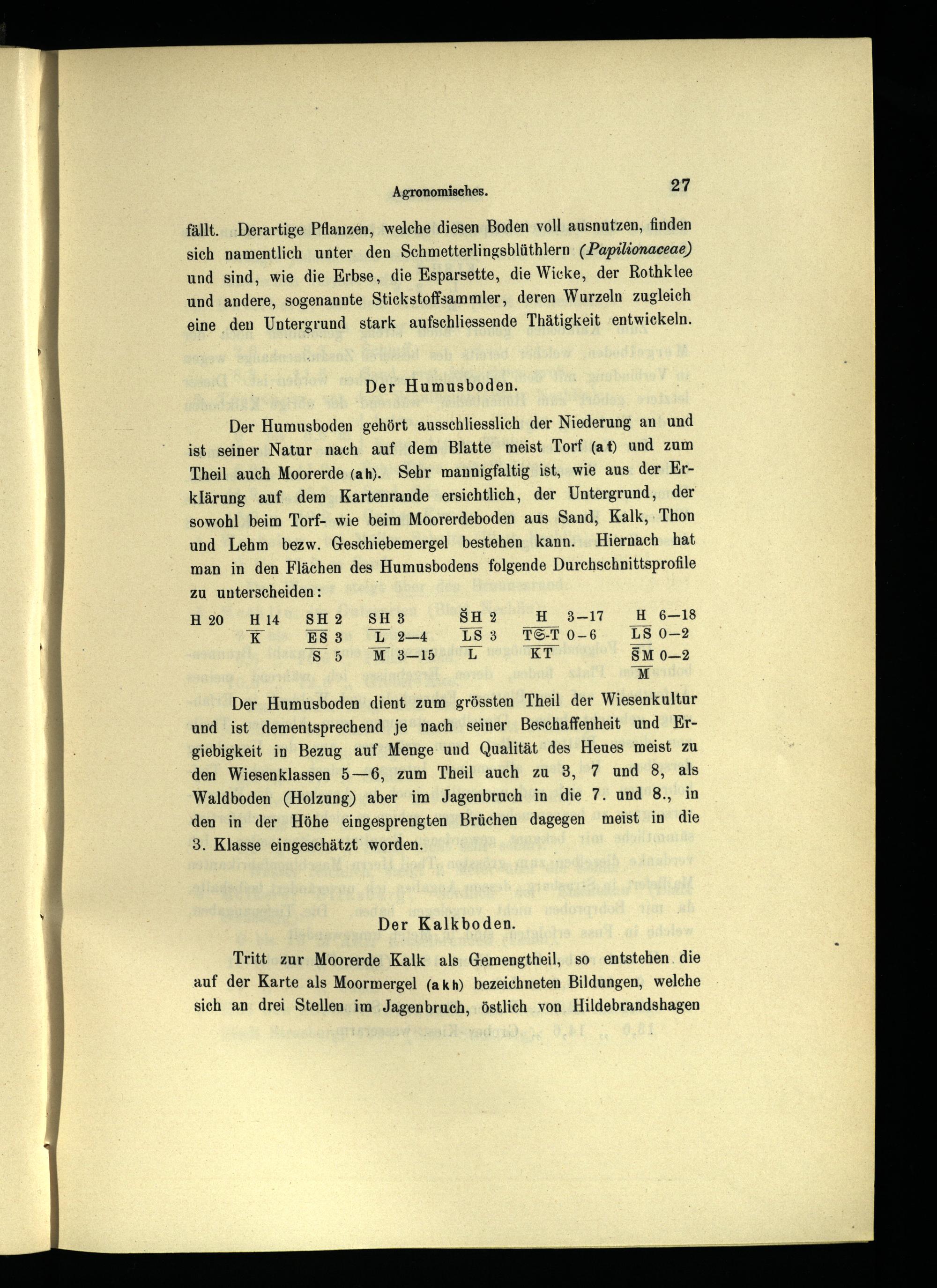 Der Humusboden gehört ausschliesslich der Niederung an und ist seiner Natur nach auf dem Blatte meist Torf(at) und zum Theil auch Moorerde(ah). Sehr mannigfaltig ist, wie aus der Erklärung auf dem Kartenrande ersichtlich, der Untergrund, der sowohl beim Torf- wie beim Moorerdeboden aus Sand, Kalk, Thon und Lehm bezw. Geschiebemergel bestehen kann. Hiernach hat man in den Flächen des Humusbodens folgende Durchschnittsprofile zu unterscheiden: