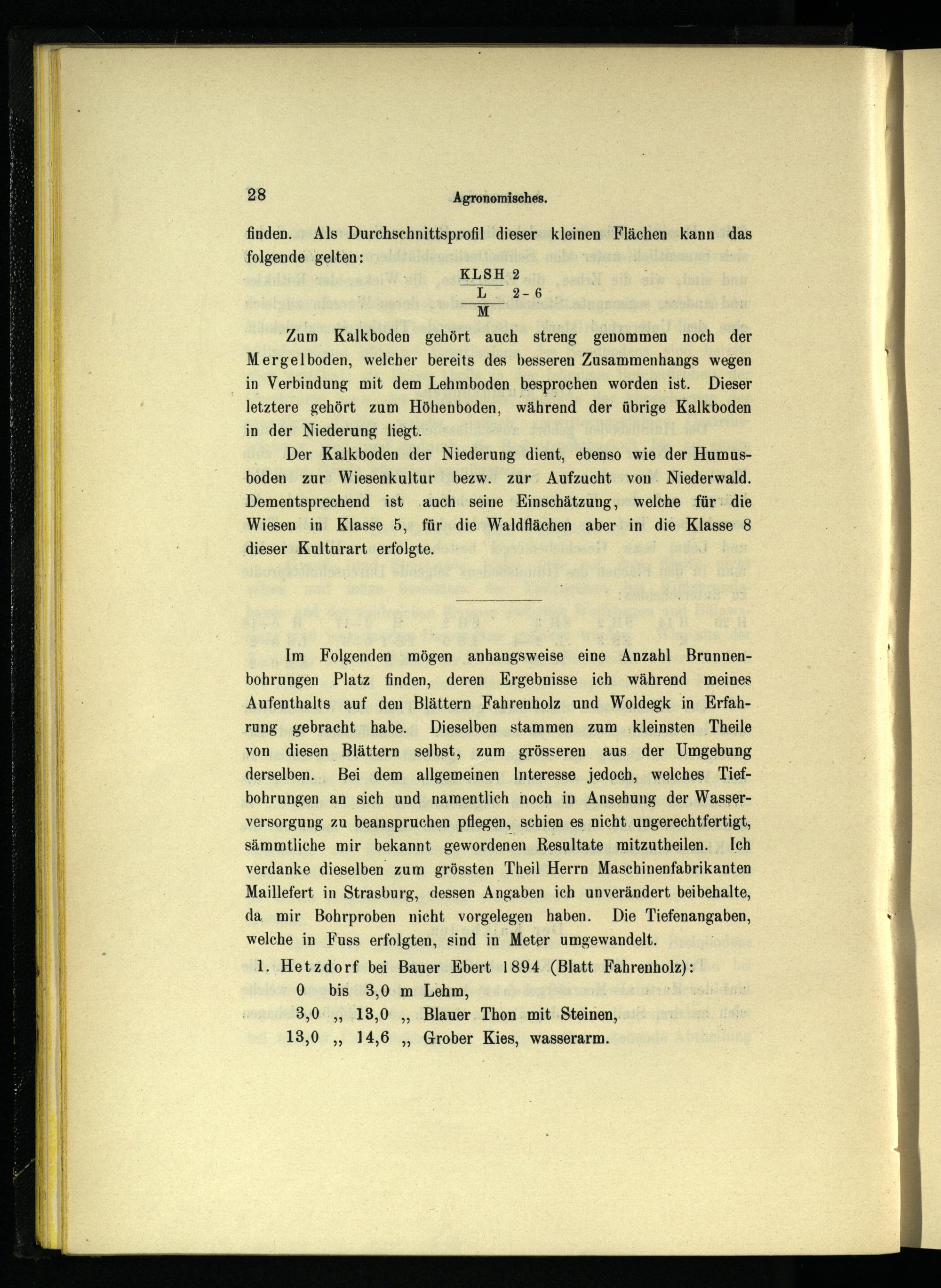 Der Kalkboden der Niederung dient, ebenso wie der Humusboden zur Wiesenkultur bezw. zur Aufzucht von. Niederwald. Dementsprechend ist.auch seine Einschätzung, welche für‘ die Wiesen in Klasse 5, für die Waldflächen aber in die Klasse 8 dieser Kulturart erfolgte.