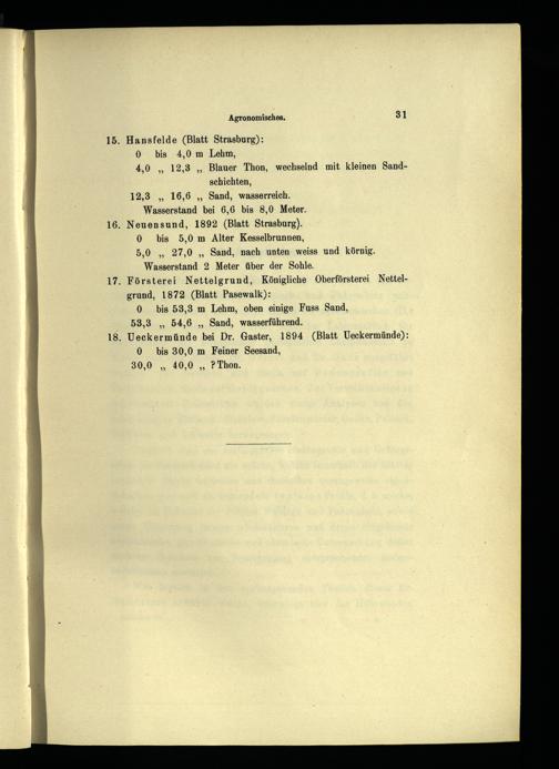 Hansfelde(Blatt Strasburg): O0 bis 4,0 m Lehm, 4,0 ,, 12,3„„ Blauer Thon, wechselnd mit kleinen Sandschichten, 12,3„ 16,6 ,, Sand, wasserreich. Wasserstand bei 6,6 bis 8,0 Meter. Neuensund,. 1892(Blatt Strasburg). O0 bis 5,0 m Alter Kesselbrunnen, 5,0 ‚„ 27,0„ Sand, nach unten weiss und körnig. Wasserstand 2 Meter über der Sohle. Försterei Nettelgrund, Königliche Oberförsterei Nettelgrund, 1872(Blatt Pasewalk ): 0 bis 58,3 m Lehm, oben einige Fuss Sand, 53,3 ‚, 54,6 ‚, Sand, wasserführend. Ueckermünde bei Dr. Gaster, 1894(Blatt Ueckermünde ): O0 bis 30,0 m Feiner Seesand, 30,0 ,, 40,0 ‚,? Thon: