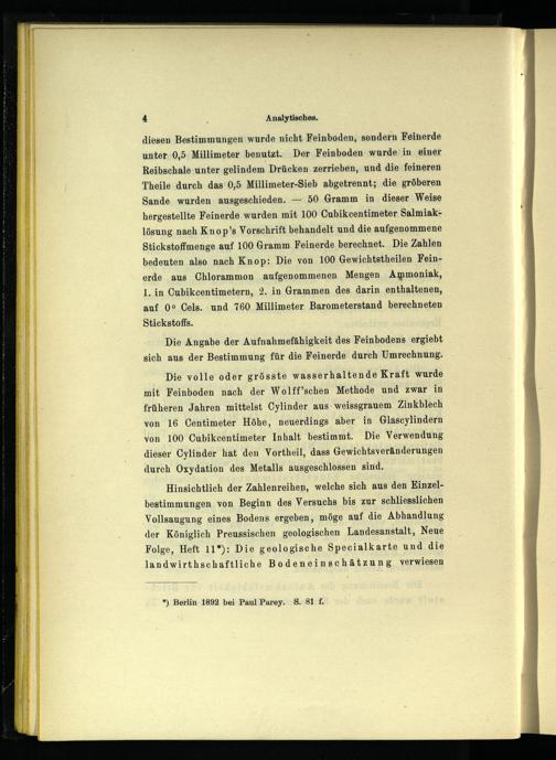 Hinsichtlich der Zahlenreihen, welche sich aus den Einzelbestimmungen. von Beginn des Versuchs bis zur schliesslichen Vollsaugung eines Bodens ergeben, möge auf die Abhandlung der Königlich Preussischen geologischen Landesanstalt, Neue Folge, Heft 11*): Die geologische Specialkarte und die landwirthschaftliche Bodeneinschätzung verwiesen