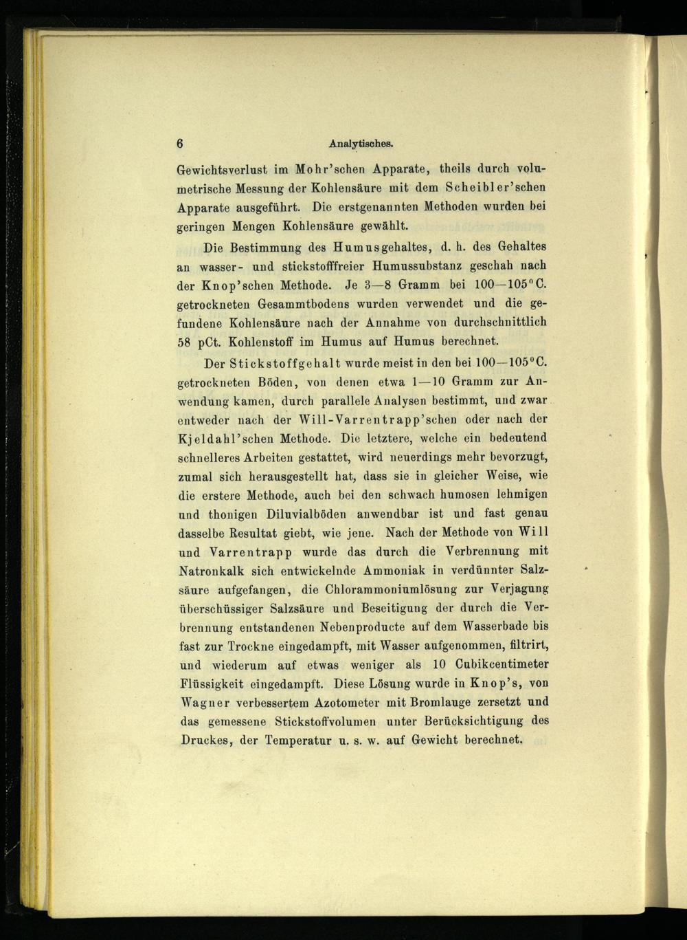 Der Stickstoffgehalt wurde meist in den bei 100—105°C. getrockneten Böden, von denen etwa 1—10 Gramm zur Anwendung kamen, durch parallele Analysen bestimmt, und zwar. entweder nach der Will-Varrentrapp’schen oder nach der Kjeldahl’schen Methode. Die letztere, welche ein bedeutend schnelleres Arbeiten gestattet, wird neuerdings mehr bevorzugt, zumal sich herausgestellt hat, dass sie in gleicher Weise, wie die erstere Methode, auch bei den schwach humosen lehmigen und thonigen Diluvialböden anwendbar ist und fast genau dasselbe Resultat giebt, wie jene. Nach der Methode von Will und Varrentrapp wurde das durch die Verbrennung mit Natronkalk sich entwickelnde Ammoniak in verdünnter Salzsäure aufgefangen, die Chlorammoniumlösung zur Verjagung überschüssiger Salzsäure und Beseitigung der durch die Verbrennung entstandenen Nebenproducte auf dem Wasserbade bis fast zur Trockne eingedampft, mit Wasser aufgenommen, filtrirt, und wiederum auf etwas weniger als 10 Cubikcentimeter Flüssigkeit eingedampft. Diese Lösung wurde in Knop’s, von Wagner verbessertem Azotometer mit Bromlauge zersetzt und das gemessene Stickstoffvolumen unter Berücksichtigung des Druckes, der Temperatur u. s. w. auf Gewicht berechnet.