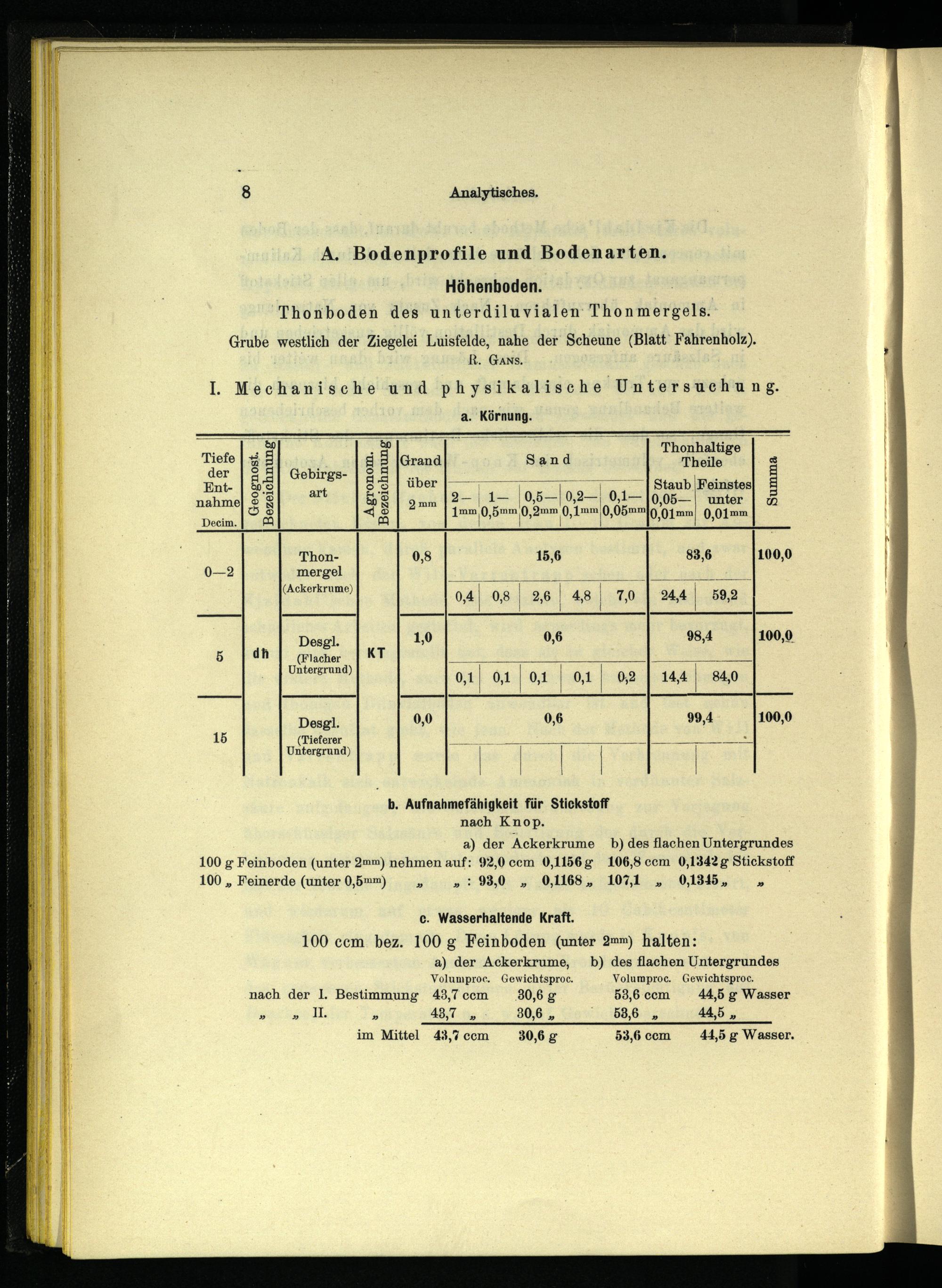 a) der Ackerkrume b) des flachen Untergrundes 100 g Feinboden(unter 2mm) nehmen auf: 92,0 ccm 0,1156 g 106,8 ccm 0,1342 g Stickstoff 100„ Feinerde(unter 0,5mm)»: 93,0„ 0,1168, 1071„ 0,1345, 2