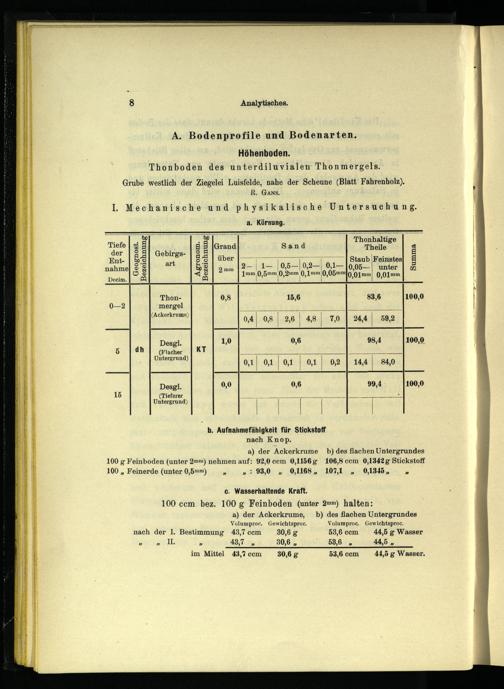 a. Körnung. „1.8 1 Thonhaltige| Tiefe| 4 3 g 3|Grand Sand Theile 8 8 der| S 5] Gebirgs-| SE]. 3 Ent-|&'S art Sg| über= N| Staub Feinstes 5] nahmel® s 50 8| 2 mm B-—| ı-|05-— 0,2 0,1— 0,05—| unter|© MOSES<S 1mm Q,5ınm 0,2mmm Q,Lmm 0, 05mm 01mm 0,01 mm Decim,[=][22]||| Thon- 0,8 15,6 100,0 0—2 mergel Er ei; ee 0,4| 0,8| 2,6| 4,8| 7,0| 24,4 AL 59,2 | Desgl. 1,0 0,6 98,4 100,0 5 dh(Flacher a A er sr ung)(1) 0,1| 0,1 0,1| 0,2 144 840 84,0 Desgl. 0,0 0,6 99,4 100,0 15(Tieferer 4_.