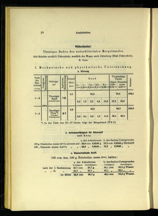 a. der Ackerkrume b. des flachen Untergrundes 100 g Feinboden(unter 2mm) nehmen auf: 43,0 ccm 0, 0540 g 75,2 ccm 0,0944 g Stickstoff 100„ Feinerde(unter 0,5mm): 43,3„ 0,0544, 75,3„ 0,0945» c. Wasserhaltende Kraft.