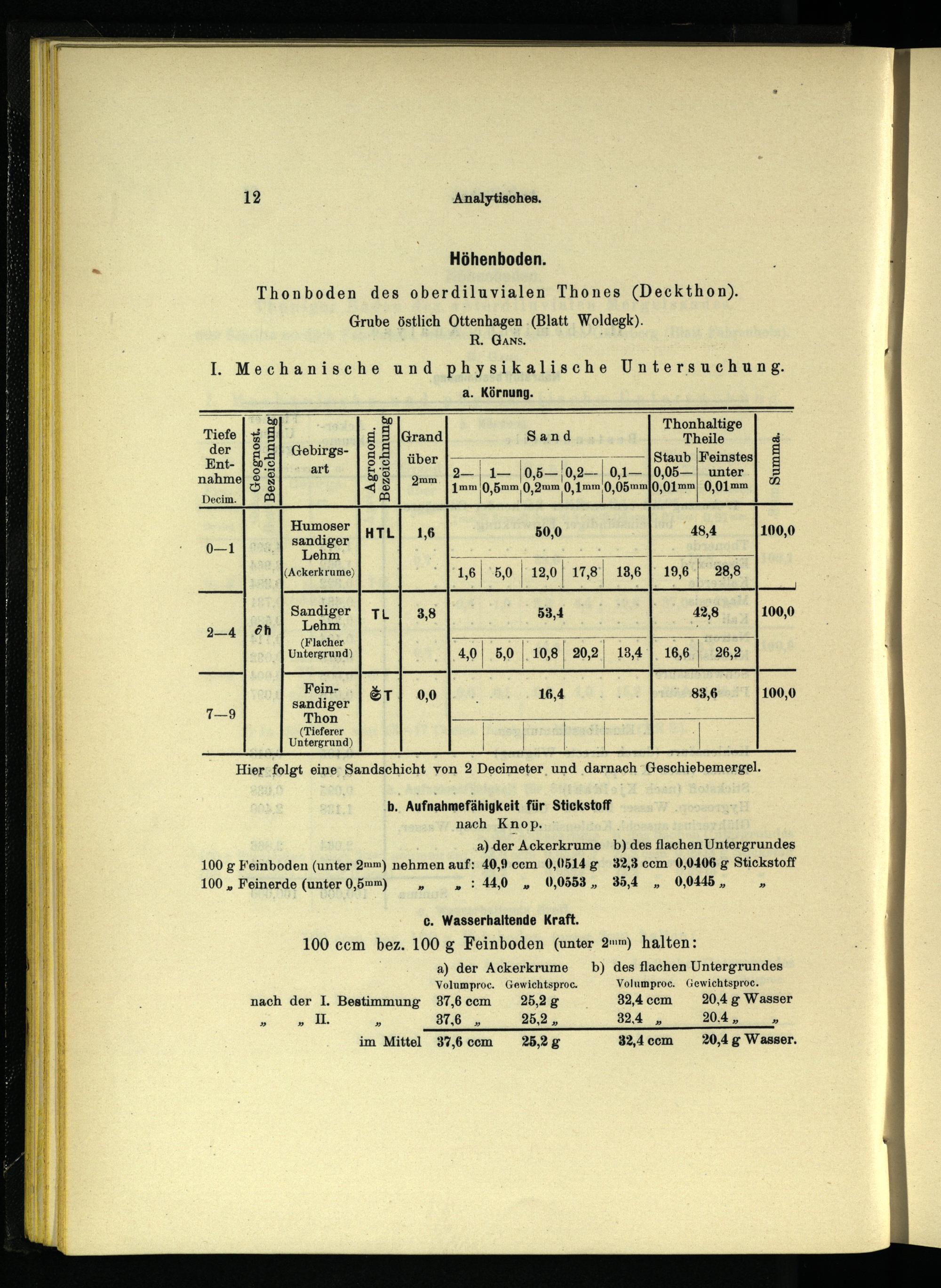 b. Aufnahmefähigkeit für Stickstoff nach Knop, a) der Ackerkrume b) des flachen Untergrundes 100 g Feinboden(unter 2mm) nehmen auf: 40,9 ccm 0,0514 g 32,3 ccm 0,0406 g Stickstoff 100„ Feinerde(unter 0,5mm)»»: 44,0„ 0,0553, 35,4„ 0,0445,»