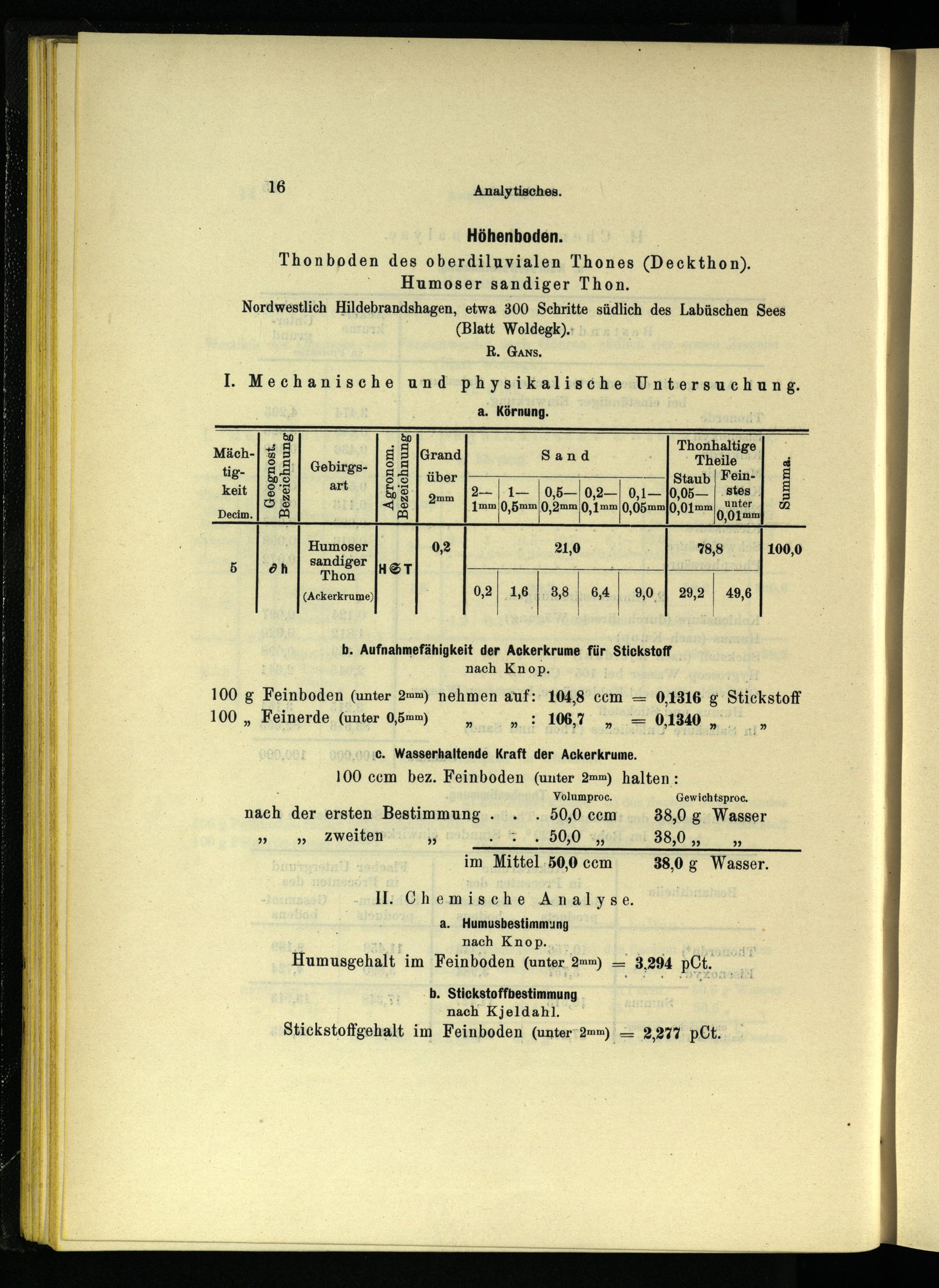 b. Aufnahmefähigkeit der Ackerkrume für Stickstoff nach Knop. 100 g Feinboden(unter 2=m) nehmen auf: 104,8 ccm— 0,1316 g Stickstoff 100„ Feinerde(unter 0,5mm)„1 106.7„= 01340,