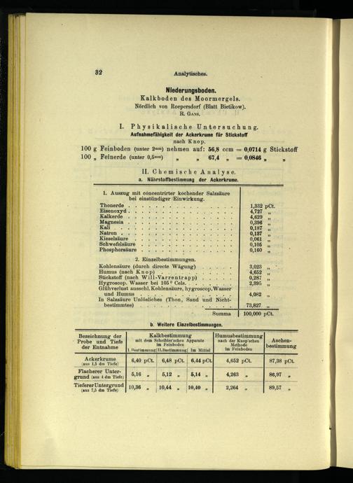 Bezeichnung der Kalkbestimmung Humusbestimmung « Probe und Tiefe mit dem Scheibler’schen Apparate nach der Knop’schen. Aschenim Feinboden Methode bestimmung