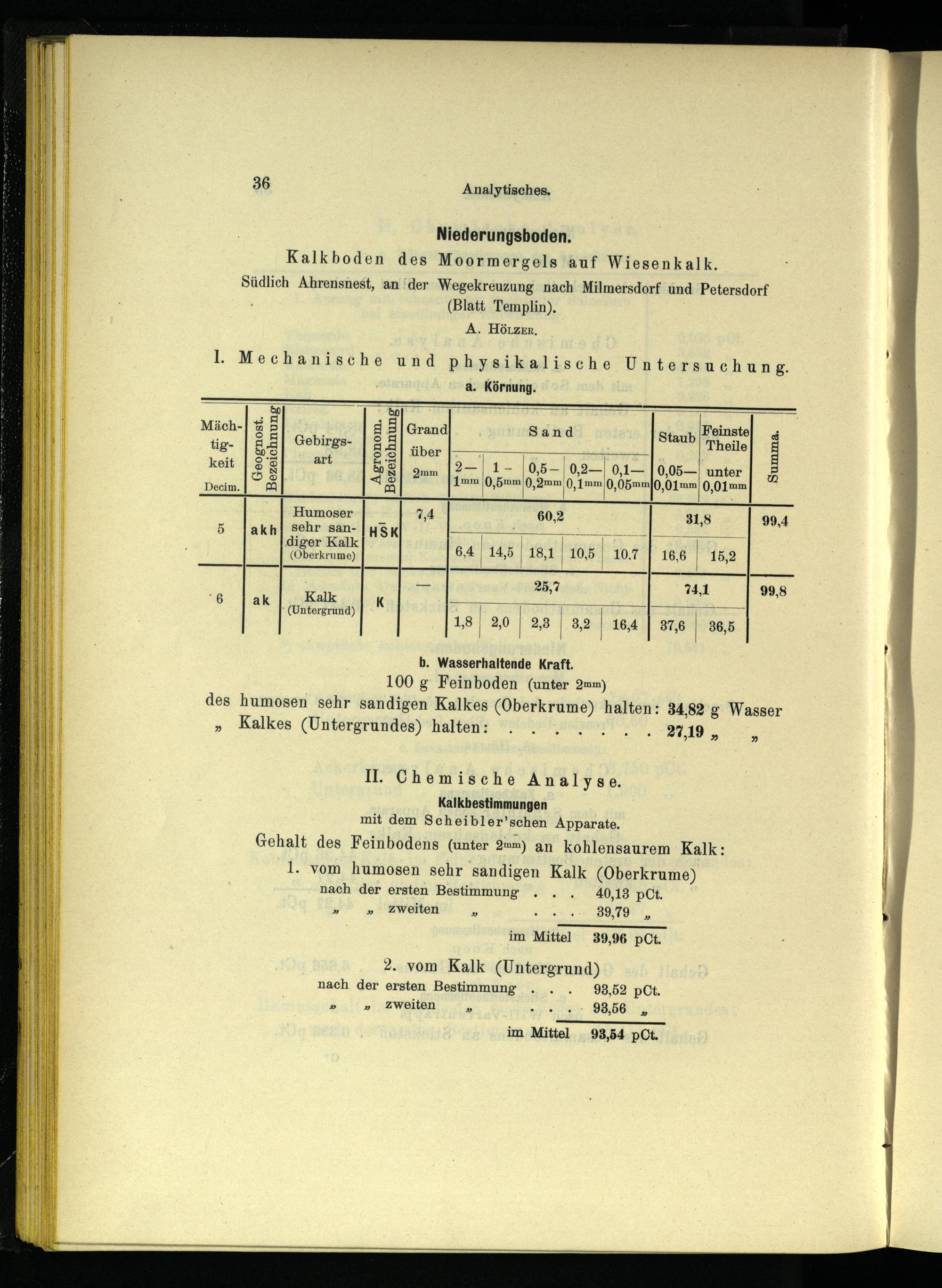 Kraft. 100 g‘ Feinboden(unter 2mm) des humosen sehr sandigen Kalkes(Oberkrume) halten: 34,82 g Wasser „ Kalkes(Untergrundes) halten: 1 a 27.190.