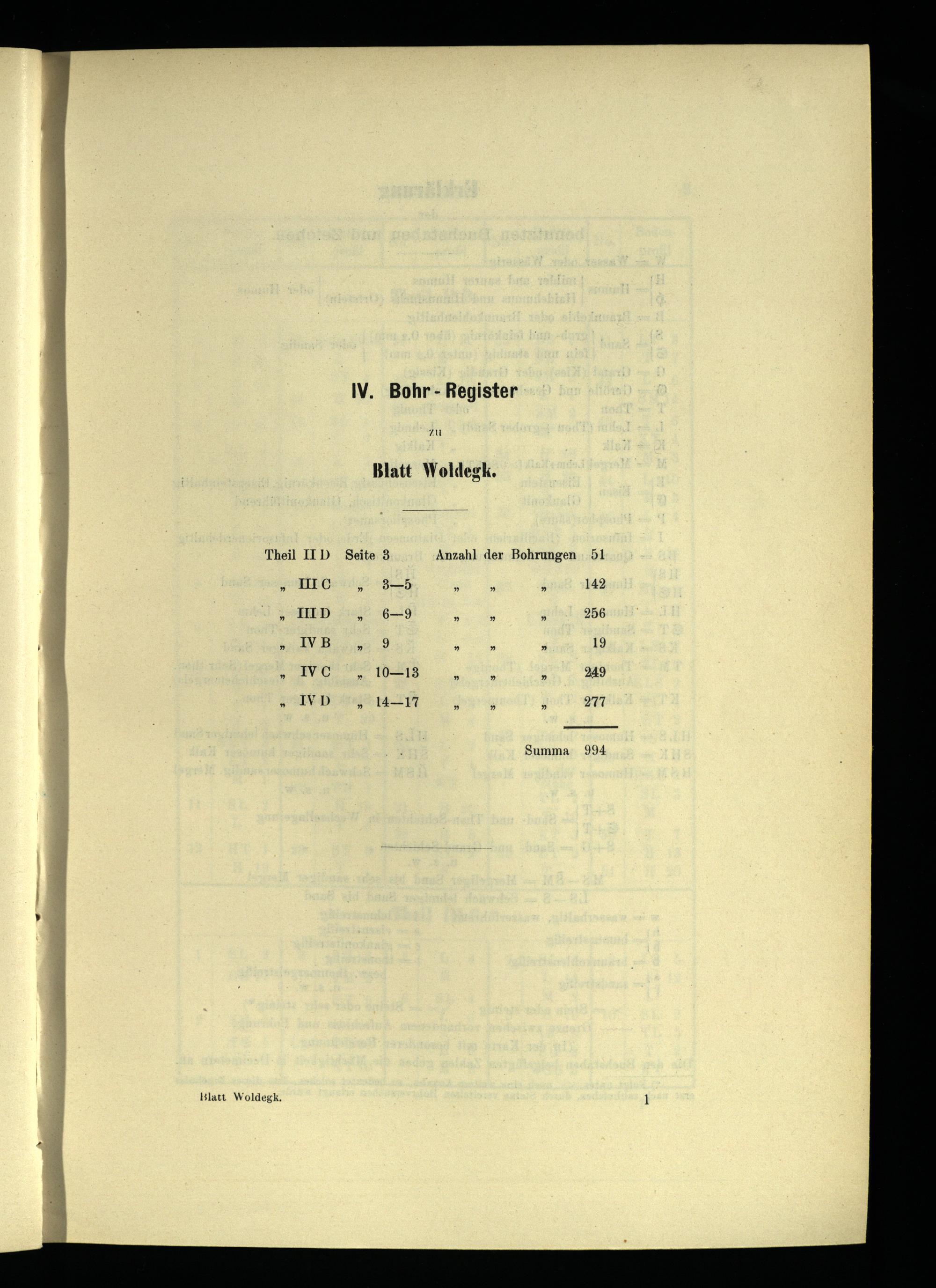 Theil IID Blatt Woldegk , ” ” »” ” ” HIC IND IVB IVC IVD ” ” Seite 3 Zu IV. Bohr- Register Blatt Woldegk, Anzahl der Bohrungen ı 51 Summa 142 19 249 277 994
