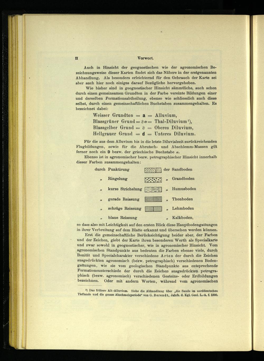 Weisser Grundton= a= Alluvium, Blassgrüner Grund= 0@= Thal-Diluvium'), Blassgelber Grund== 0= Oberes Diluvium, Hellgrauer Grund= d= Unteres Diluvium. Für die aus dem Alluvium bis in die letzte Diluvialzeit zurückreichenden Flugbildungen, sowie für die Abrutsch- und Abschlemm-Massen gilt ferner noch ein D bezw. der griechische Buchstabe«.