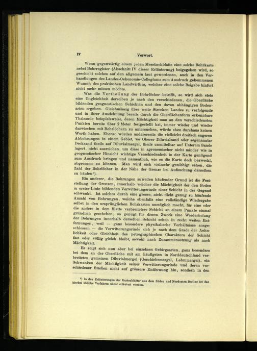 Was die Vertheilung der Bohrlöcher betrifft, so wird sich stets eine Ungleichheit derselben je nach den verschiedenen, die Oberfläche bildenden geognostischen Schichten und den davon abhängigen Bodenarten ergeben. Gleichmässig über weite Strecken Landes zu verfolgende und in ihrer Ausdehnung bereits durch die Oberflächenform erkennbare Thalsande beispielsweise, deren Mächtigkeit man an den verschiedensten Punkten bereits über 2 Meter festgestellt hat, immer wieder und wieder dazwischen mit Bohrlöchern zu untersuchen, würde eben durchaus keinen Werth haben. Ebenso würden andererseits die vielleicht dreifach engeren Abbohrungen in einem Gebiet, wo Oberer Diluvialsand oder sogenannter Decksand theils auf Diluvialmergel, theils unmittelbar auf Unterem Sande lagert, nicht ausreichen, um diese in agronomischer nicht minder wie in geognostischer Hinsicht wichtige Verschiedenheit in der Karte genügend zum Ausdruck bringen und namentlich, wie es die Karte doch bezweckt, abgrenzen zu können. Man wird sich vielmehr genöthigt sehen, die Zahl der Bohrlöcher in der Nähe der Grenze bei Aufsuchung derselben zu häufen').