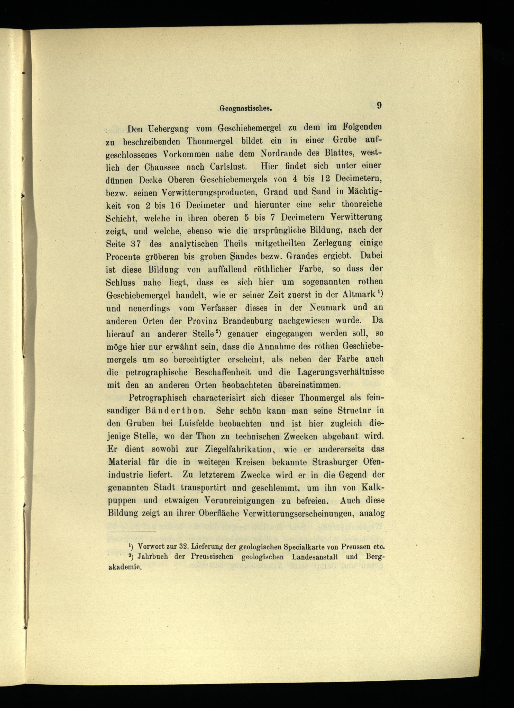 Den Uebergang vom Geschiebemergel zu dem im Folgenden zu beschreibenden Thonmergel bildet ein in einer Grube aufgeschlossenes Vorkommen nahe dem Nordrande des Blattes, westlich der Chaussee nach Carlslust. Hier findet sich unter einer dünnen Decke Oberen Geschiebemergels von 4 bis 12 Decimetern, bezw. seinen Verwitterungsproducten, Grand und Sand in Mächtigkeit von 2 bis 16 Decimeter und hierunter eine sehr thonreiche Schicht, welche in ihren oberen 5 bis 7 Decimetern Verwitterung zeigt, und welche, ebenso wie die ursprüngliche Bildung, nach der Seite 37 des analytischen Theils mitgetheilten Zerlegung einige Procente gröberen bis groben Sandes bezw. Grandes ergiebt. Dabei ist diese Bildung von auffallend röthlicher Farbe, so dass der Schluss nahe liegt, dass es sich hier um sogenannten rothen Geschiebemergel handelt, wie er seiner Zeit zuerst in der Altmark*) und neuerdings vom Verfasser dieses in der Neumark und an anderen Orten der Provinz Brandenburg nachgewiesen wurde. Da hierauf an anderer Stelle”) genauer eingegangen werden soll, so möge hier nur erwähnt sein, dass die Annahme des rothen Geschiebemergels um so berechtigter erscheint, als neben der Farbe auch die petrographische Beschaffenheit und die Lagerungsverhältnisse mit den an anderen Orten beobachteten übereinstimmen.