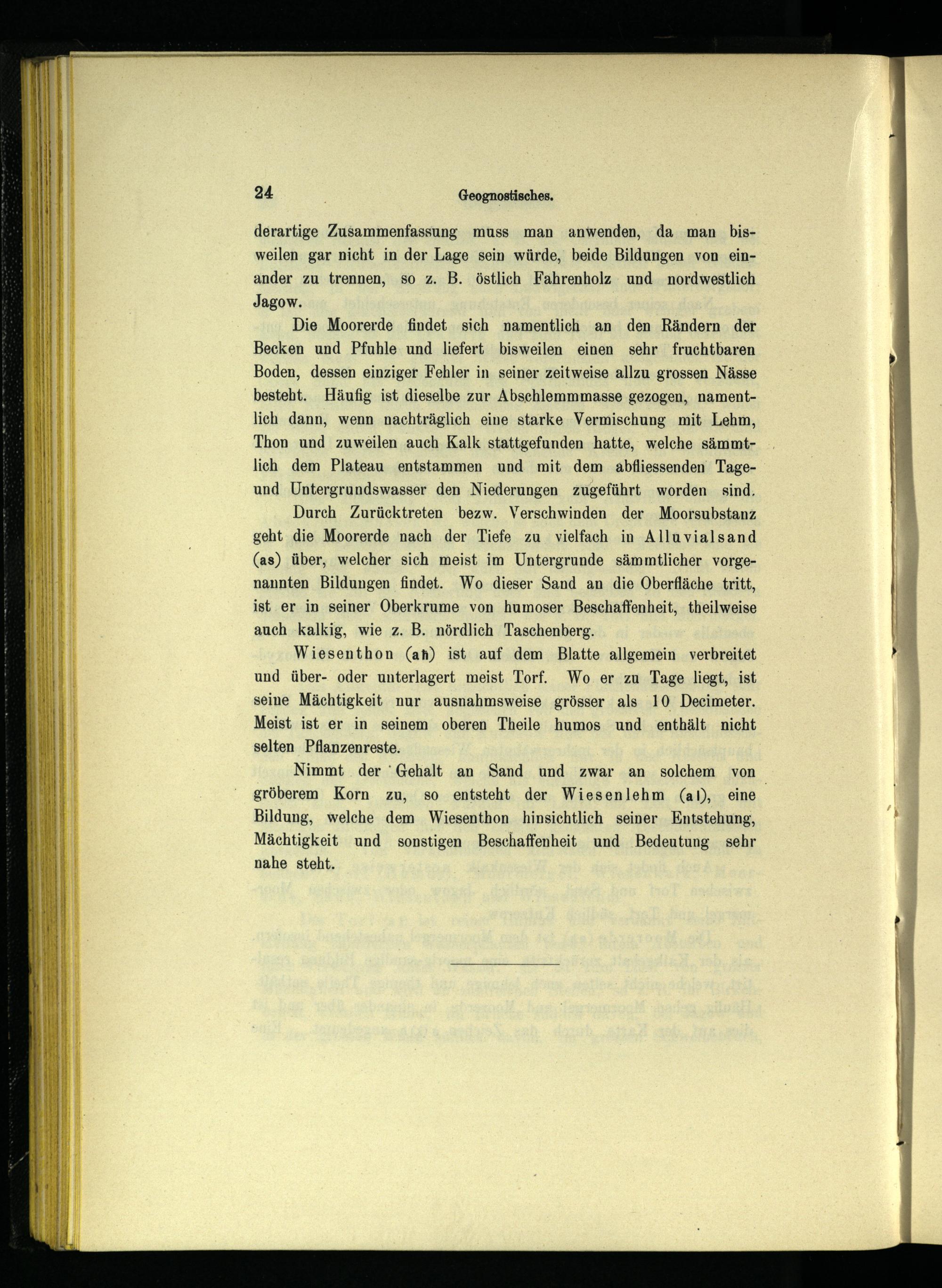 Wiesenthon(an) ist auf dem Blatte allgemein verbreitet und über- oder unterlagert meist Torf. Wo. er zu Tage liegt, ist seine Mächtigkeit nur ausnahmsweise grösser als 10 Decimeter. Meist ist er in seinem oberen Theile humos und enthält nicht selten Pflanzenreste.