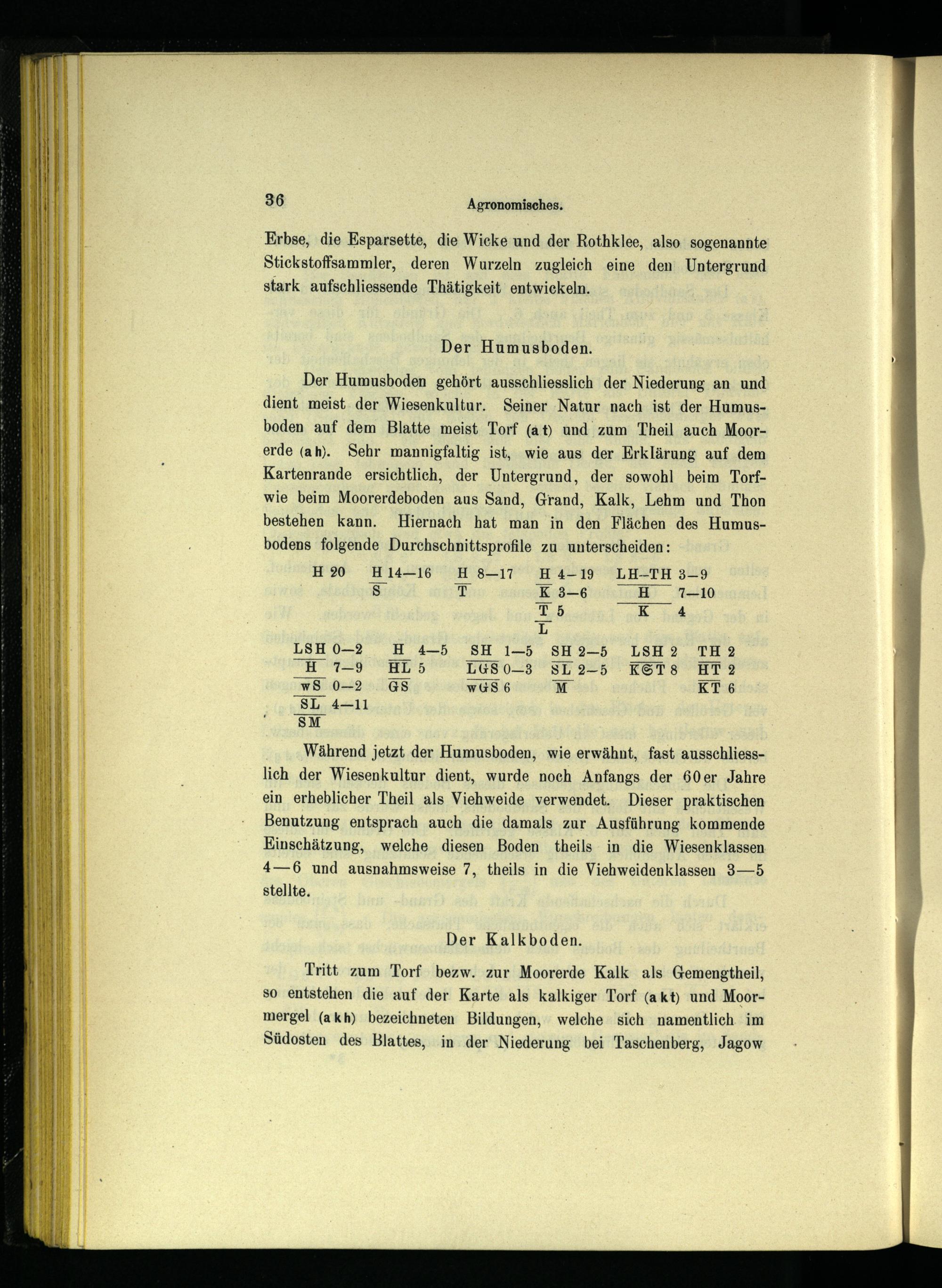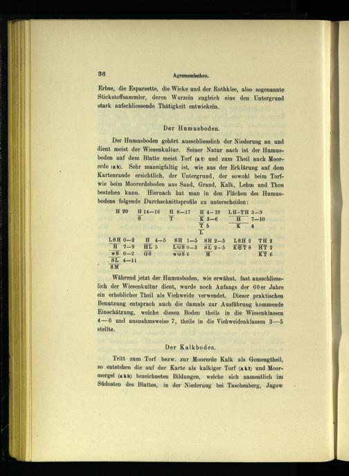 Der Humusboden gehört ausschliesslich der Niederung an und dient meist. der Wiesenkultur. Seiner Natur nach ist der Humusboden auf dem Blatte meist Torf(at) und zum Theil auch Moorerde(ah). Sehr mannigfaltig ist, wie aus der Erklärung auf dem Kartenrande ersichtlich, der Untergrund, der sowohl beim Torfwie beim Moorerdeboden aus Sand, Grand, Kalk, Lehm und Thon bestehen kann. Hiernach hat man in den Flächen des Humusbodens folgende Durchschnittsprofile zu unterscheiden:
