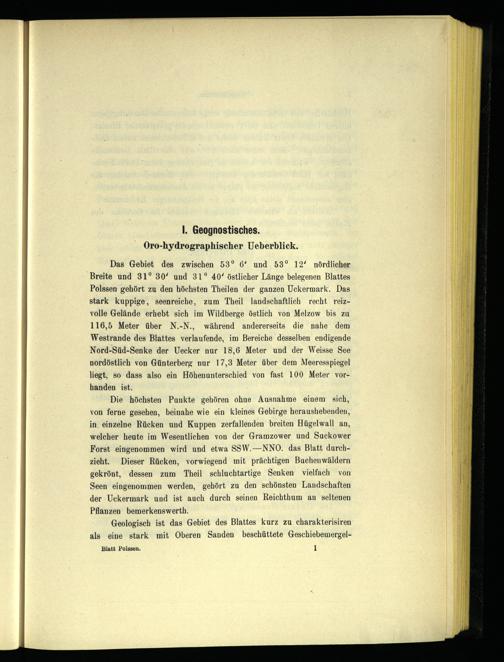 Das Gebiet des zwischen 53° 6‘ und 53° 12’ nördlicher Breite und 31° 30‘ und 31° 40‘ östlicher Länge belegenen Blattes Polssen gehört zu den höchsten Theilen der ganzen Uckermark . Das stark kuppige, seenreiche, zum Theil landschaftlich recht reizvolle Gelände erhebt sich im Wildberge östlich von Melzow bis zu 116,5 Meter über N.-N., während andererseits die nahe dem Westrande des Blattes verlaufende, im Bereiche desselben endigende Nord-Süd-Senke der Uecker nur 18,6 Meter und der Weisse See nordöstlich von Günterberg nur 17,3 Meter über dem Meeresspiegel liegt, so dass also ein Höhenunterschied von fast 100 Meter vorhanden ist.