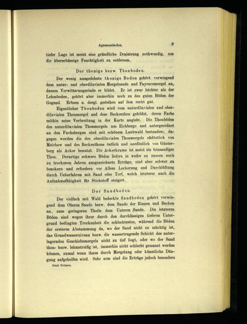 Eigentlicher'Thonboden wird vom unterdiluvialen und oberdiluvialen Thonmergel und dem Beckenthon gebildet, deren Farbe mithin seine Verbreitung in der Karte angiebt. Die Thonböden des unterdiluvialen Thonmergels am KEichberge und untergeordnet an den Fuchsbergen sind mit schönem Laubwald bestanden; dagegen werden die des oberdiluvialen Thonmergels südöstlich von Meichow und des Beckenthons östlich und nordöstlich von Günterberg als Acker benutzt. Die Ackerkrume ist meist ein feinsandiger. Thon. Derartige schwere Böden liefern in weder zu nassen noch zu trockenen Jahren ausgezeichnete Erträge, sind aber schwer zu beackern und erfordern vor Allem Lockerung und Durchlüftung durch Ueberfahren mit Sand oder Torf, welch letzterer auch die Aufnahmefähigkeit für Stickstoff steigert.