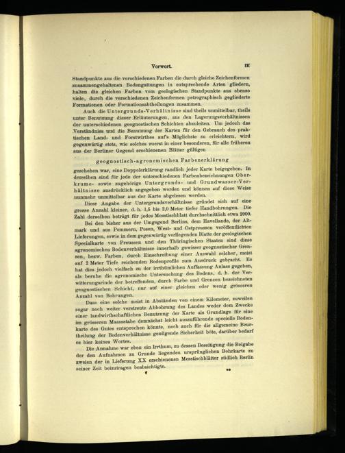 Bei den bisher aus der Umgegend Berlins , dem Havellande, der Altmark und aus Pommern , Posen, West- und Ostpreussen veröffentlichten Lieferungen, sowie in dem gegenwärtig vorliegenden Blatte der geologischen Specialkarte von Preussen und den Thüringischen Staaten sind diese agronomischen Bodenverhältnisse innerhalb gewisser geognostischer Grenzen, bezw. Farben, durch Einschreibung einer Auswahl. solcher‘, meist auf 2 Meter Tiefe reichenden Bodenprofile zum Ausdruck gebracht. Es hat dies jedoch vielfach zu der irrthümlichen Auffassung Anlass gegeben, als beruhe die agronomische Untersuchung des Bodens, d. h. der Verwitterungsrinde der betreffenden, durch Farbe und Grenzen bezeichneten geognostischen Schicht, nur auf einer gleichen oder wenig grösseren Anzahl von Bohrungen.