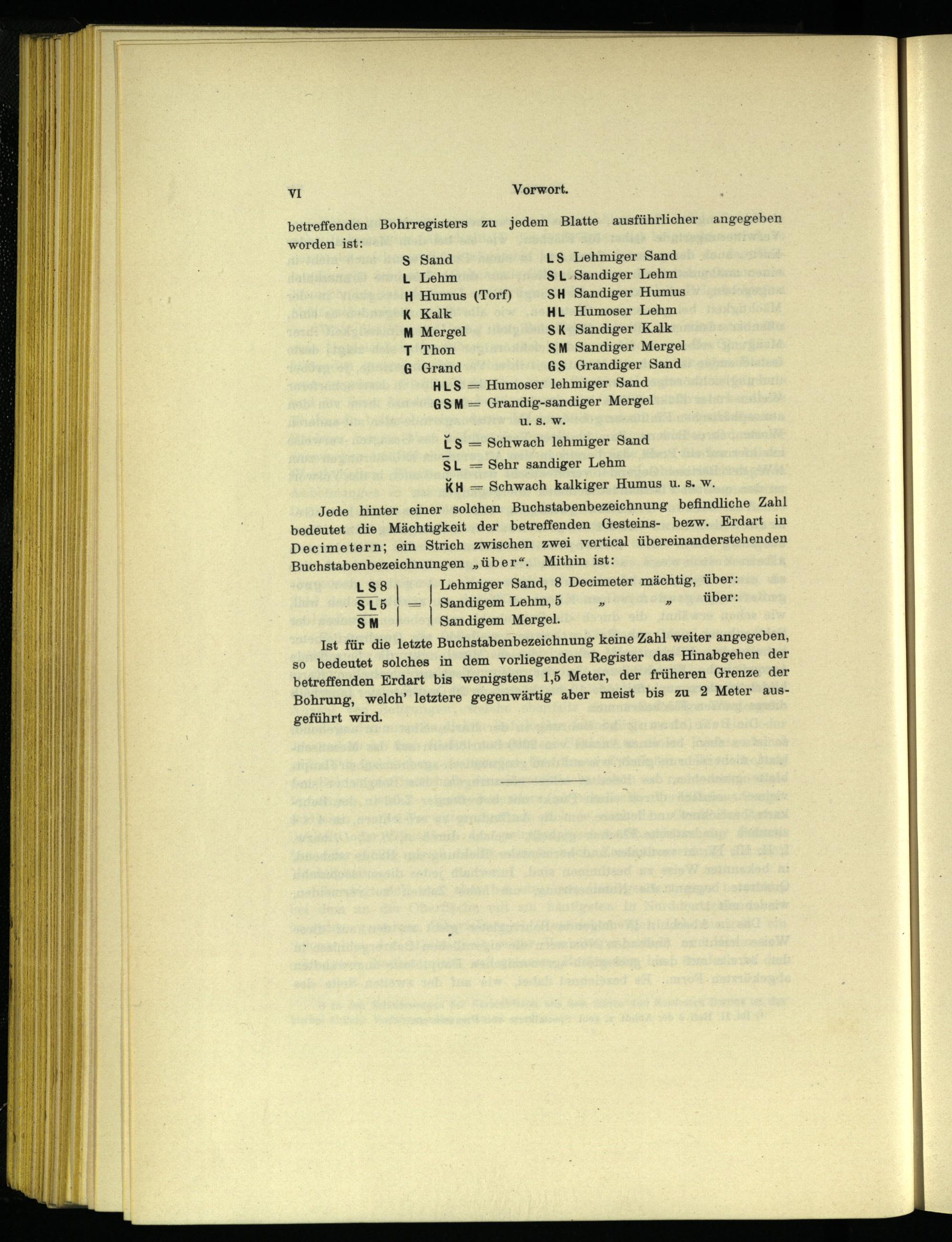 betreffenden Bohrregisters zu jedem Blatte ausführlicher angegeben worden ist: S Sand LS Lehmiger Sand L Lehm S$ L.Sandiger Lehm H Humus(Torf) SH Sandiger Humus K Kalk HL Humoser Lehm M Mergel SK Sandiger Kalk T Thon SM Sandiger Mergel G Grand GS Grandiger Sand HLS— Humoser lehmiger Sand GSM— Grandig-sandiger Mergel u. 8. W.