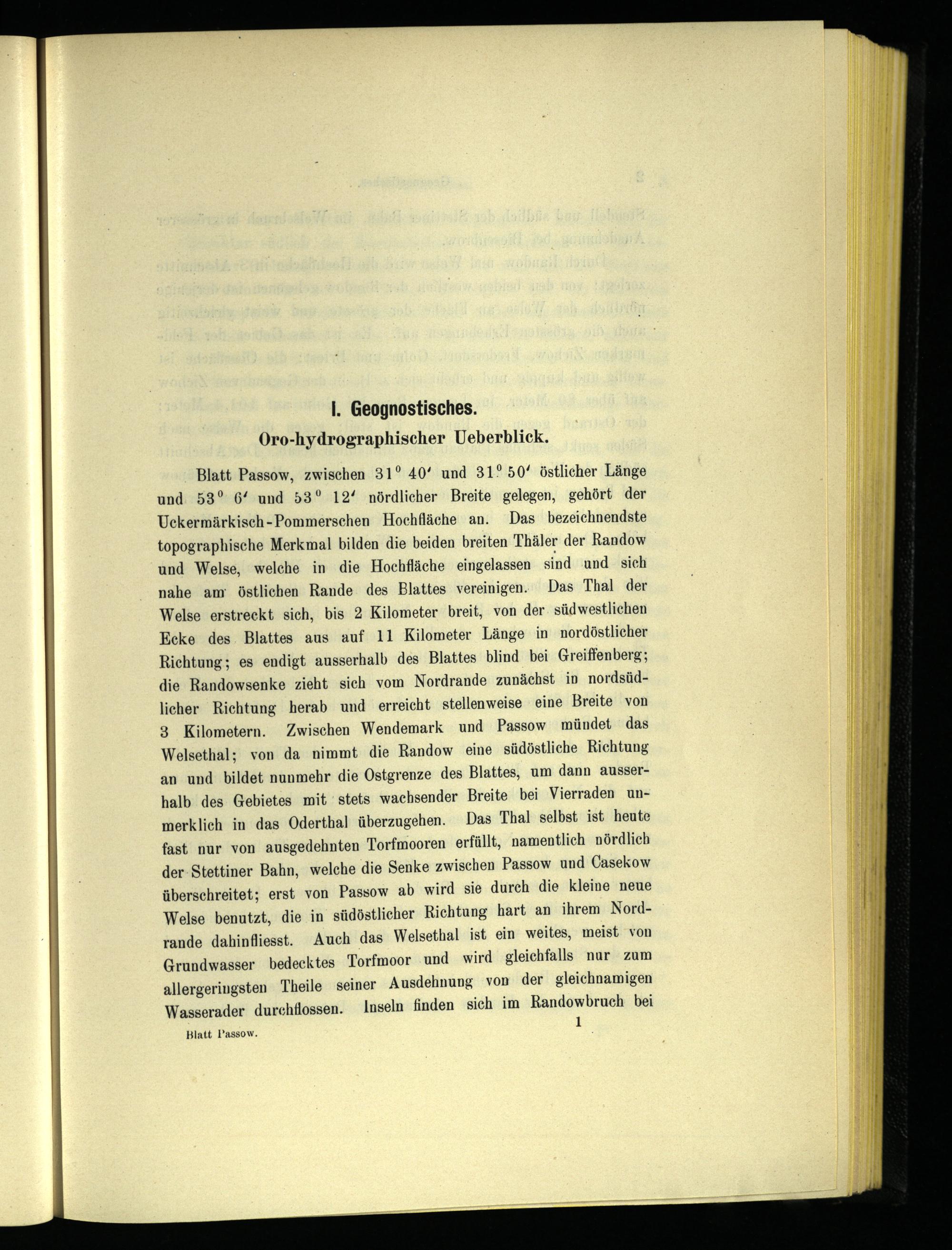 Blatt Passow, zwischen 31° 40‘ und 31° 50‘ östlicher Länge und 53° 6‘ und 53° 12‘ nördlicher Breite gelegen, gehört der Uckermärkisch-Pommerschen Hochfläche an. Das bezeichnendste topographische Merkmal bilden die beiden breiten Thäler der Randow und Welse, welche in die Hochfläche eingelassen sind und sich nahe am östlichen Rande des Blattes vereinigen. Das Thal der Welse erstreckt sich, bis 2 Kilometer breit, von der südwestlichen Ecke des. Blattes aus auf 11 Kilometer Länge in nordöstlicher Richtung; es endigt ausserhalb des Blattes blind bei Greiffenberg ; die Randowsenke zieht sich vom Nordrande zunächst in nordsüdlicher Richtung herab und erreicht stellenweise eine Breite von 3 Kilometern. Zwischen Wendemark und Passow mündet das Welsethal; von da nimmt die Randow eine südöstliche Richtung an und bildet nunmehr die Ostgrenze des Blattes, um dann ausserhalb des Gebietes mit stets wachsender Breite bei Vierraden unmerklich in das Oderthal überzugehen. Das Thal selbst ist heute fast nur von ausgedehnten Torfmooren erfüllt, namentlich nördlich der-Stettiner Bahn, welche die Senke zwischen Passow und Casekow überschreitet; erst von Passow ab wird sie durch die kleine neue Welse benutzt, die in südöstlicher Richtung hart an ihrem Nordrande dahinfliesst. Auch das Welsethal ist ein weites, meist von Grundwasser bedecktes Torfmoor und wird gleichfalls nur zum allergeringsten Theile seiner Ausdehnung von der gleichnamigen Wasserader durchflossen. Inseln finden sich im Randowbruch bei 1