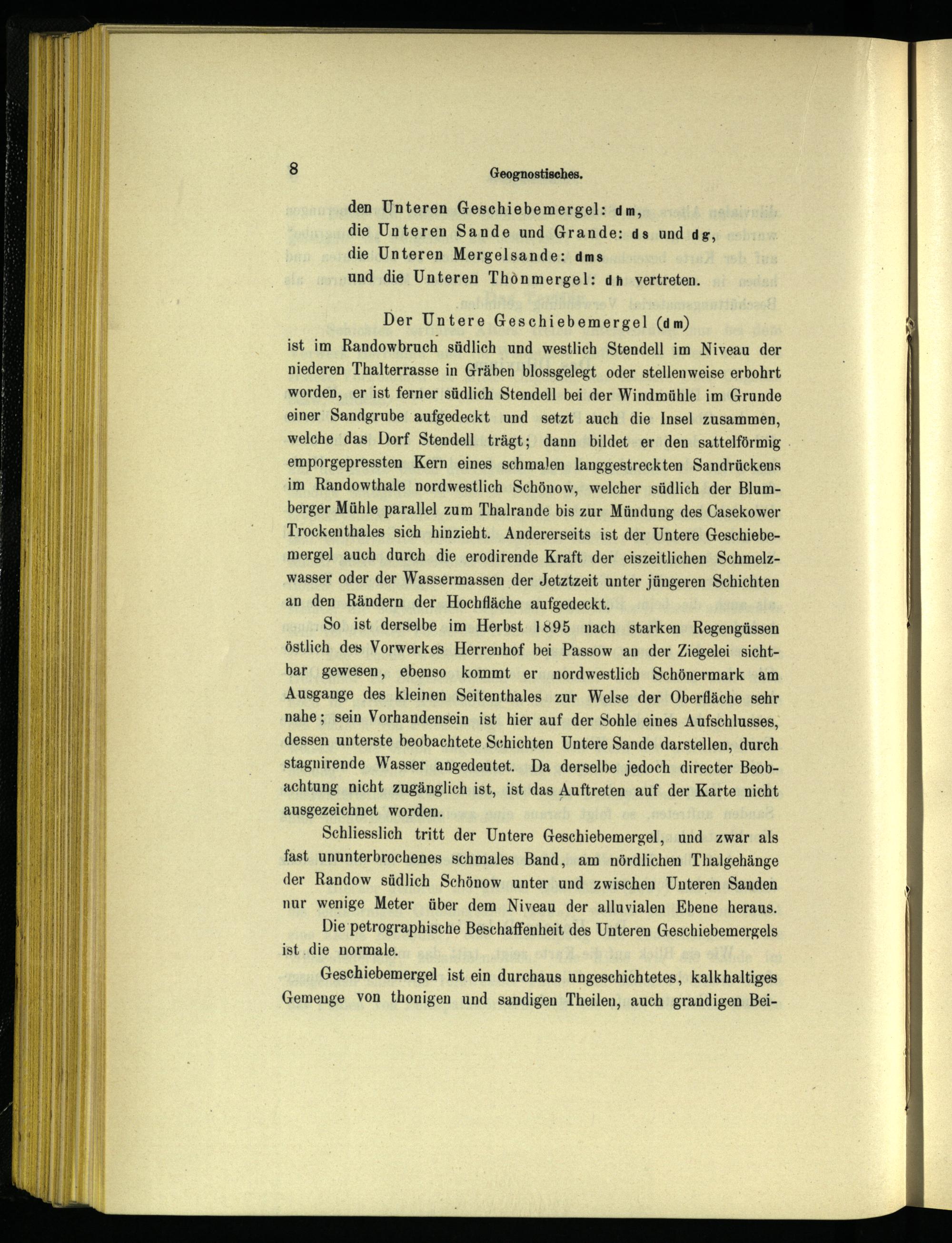 So ist derselbe im Herbst 1895 nach starken Regengüssen östlich des Vorwerkes Herrenhof bei Passow an der Ziegelei sichtbar gewesen, ebenso kommt er nordwestlich Schönermark am Ausgange des kleinen Seitenthales zur Welse der Oberfläche sehr nahe; sein Vorhandensein ist hier auf der Sohle eines Aufschlusses, dessen unterste beobachtete Schichten Untere Sande darstellen, durch stagnirende Wasser angedeutet. Da derselbe jedoch directer Beobachtung nicht zugänglich ist, ist das Auftreten auf der Karte nicht ausgezeichnet worden.