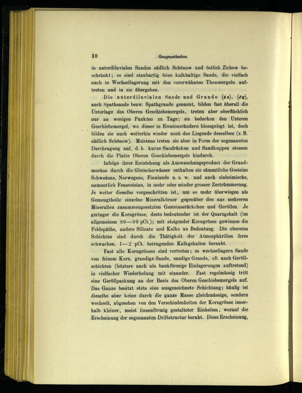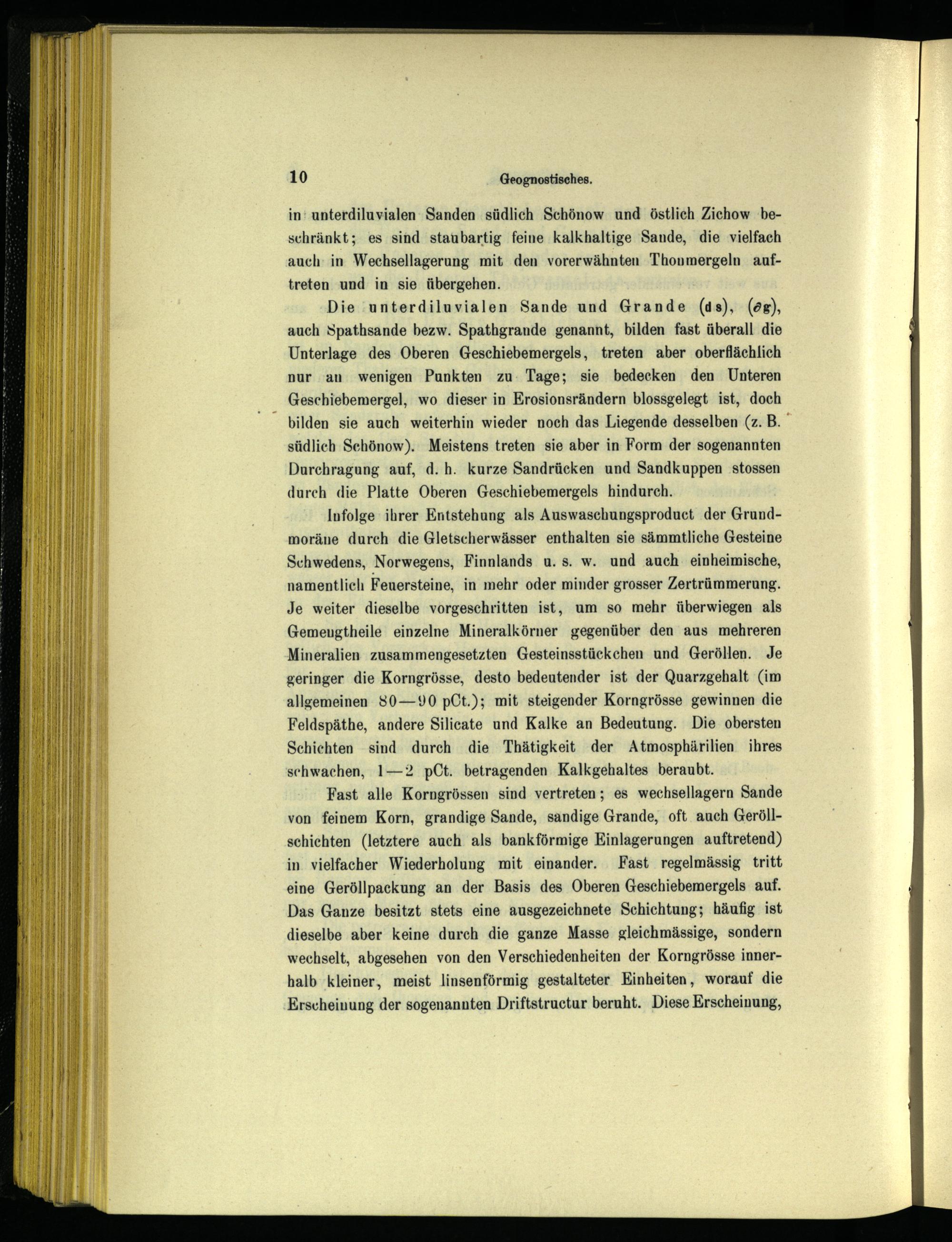 Die unterdiluvialen Sande und Grande(ds),(05), auch Spathsande bezw. Spathgrande genannt, bilden fast überall die Unterlage des Oberen Geschiebemergels, treten aber oberflächlich nur an wenigen Punkten zu. Tage; sie bedecken den Unteren Geschiebemergel, wo dieser in Erosionsrändern blossgelegt ist, doch bilden sie auch weiterhin wieder noch das Liegende desselben(z. B. südlich Schönow ). Meistens treten sie aber in Form der sogenannten Durchragung auf, d.h. kurze Sandrücken und Sandkuppen stossen durch die Platte Oberen Geschiebemergels hindurch.