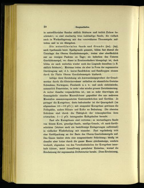 Infolge ihrer Entstehung als Auswaschungsproduct der Grundmoräne durch die Gletscherwässer enthalten sie sämmtliche Gesteine Schwedens , Norwegens , Finnlands u. s. w. und auch. einheimische, namentlich Feuersteine, in mehr oder minder grosser Zertrümmerung. Je weiter dieselbe vorgeschritten ist, um so mehr überwiegen als Gemeungtheile einzelne Mineralkörner gegenüber den aus mehreren Mineralien zusammengesetzten Gesteinsstückchen und Geröllen. Je geringer die Korngrösse, desto bedeutender ist der Quarzgehalt(im allgemeinen 80—90 pCt.); mit steigender Korngrösse gewinnen die Feldspäthe, andere Silicate und Kalke an Bedeutung. Die obersten Schichten sind durch die Thätigkeit der Atmosphärilien ihres schwachen, 1—2 pCt. betragenden Kalkgehaltes beraubt.