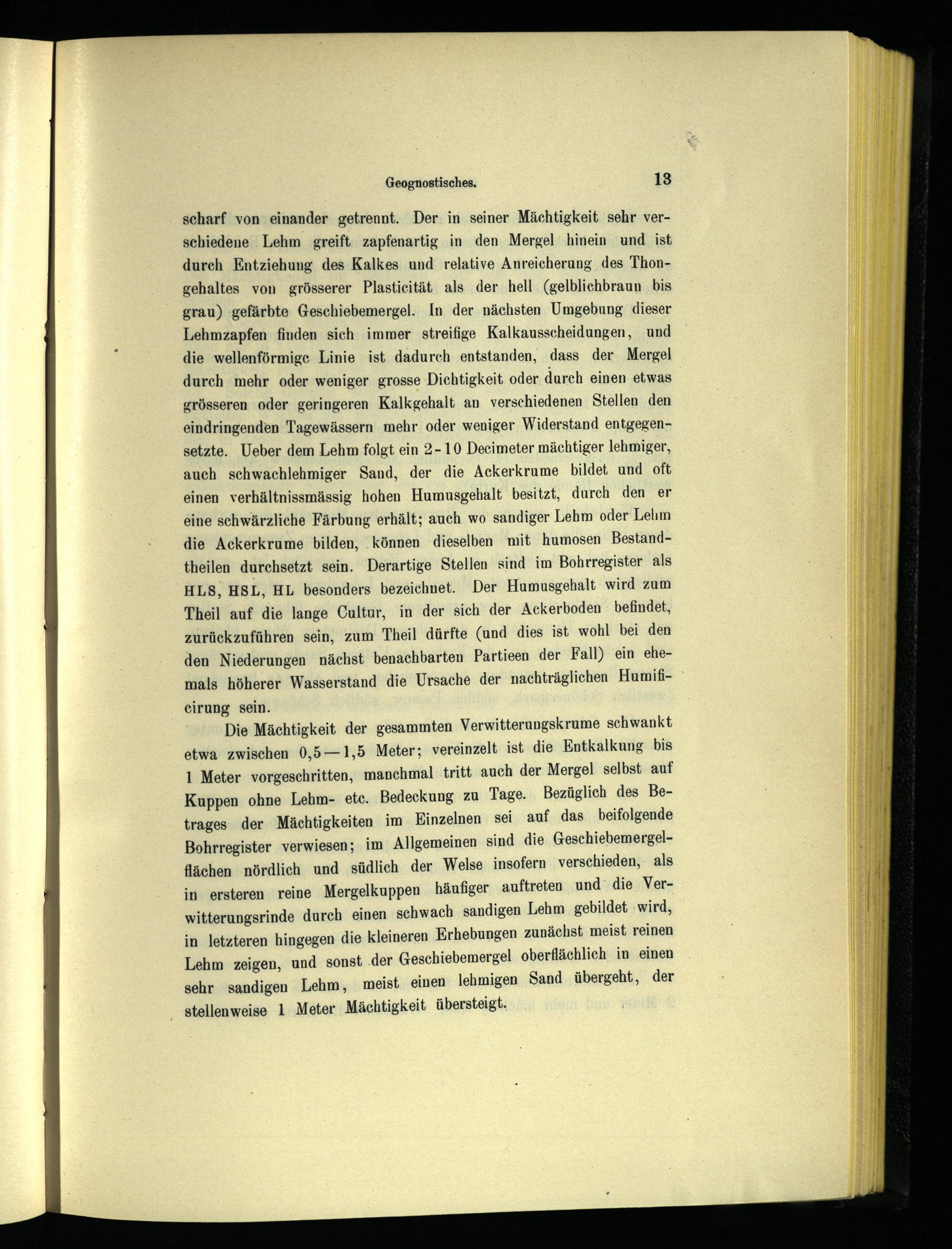 scharf von einander getrennt. Der in seiner Mächtigkeit sehr verschiedene Lehm greift zapfenartig in den Mergel hinein und ist durch Entziehung des Kalkes und relative Anreicherung des Thongehaltes von grösserer Plasticität als der hell(gelblichbraun bis grau) gefärbte Geschiebemergel. In der nächsten Umgebung dieser Lehmzapfen finden sich immer streifige Kalkausscheidungen, und die wellenförmige Linie ist dadurch entstanden, dass der Mergel durch mehr oder weniger grosse Dichtigkeit oder durch einen etwas grösseren oder geringeren Kalkgehalt an verschiedenen Stellen den eindringenden Tagewässern mehr oder weniger Widerstand entgegensetzte. Ueber dem Lehm folgt ein 2-10 Decimeter mächtiger lehmiger, auch schwachlehmiger Sand, der die Ackerkrume bildet und oft einen verhältnissmässig hohen Humusgehalt besitzt, durch den er eine schwärzliche Färbung erhält; auch wo sandiger Lehm oder Lelhım die Ackerkrume bilden, ‚können dieselben mit humosen Bestandtheilen durchsetzt sein. Derartige Stellen sind im Bohrregister als HLS, HSL, HL besonders bezeichnet. Der Humusgehalt wird zum Theil auf die lange Cultur, in der sich der Ackerboden befindet, zurückzuführen sein, zum Theil dürfte(und dies ist wohl bei den den Niederungen nächst benachbarten Partieen der Fall) ein ehemals höherer Wasserstand die Ursache der nachträglichen Humifieirung sein.