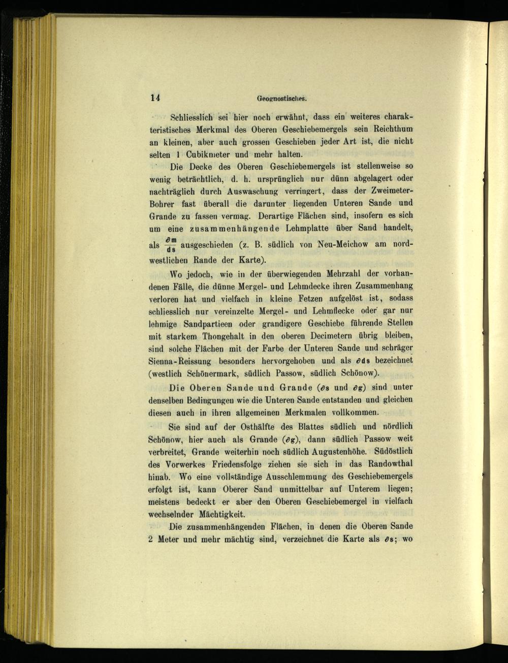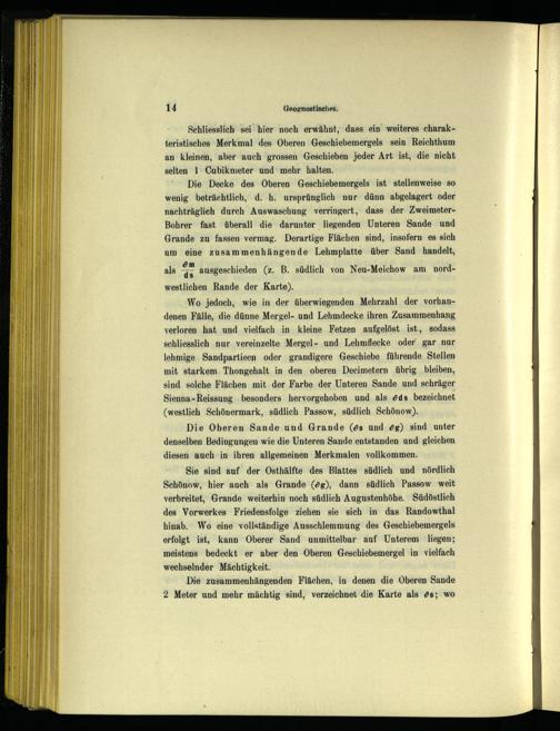 Wo jedoch, wie in der überwiegenden Mehrzahl der vorhandenen Fälle, die dünne Mergel- und Lehmdecke ihren Zusammenhang verloren hat und vielfach in kleine Fetzen aufgelöst ist, sodass schliesslich nur vereinzelte Mergel- und Lehmflecke oder‘ gar nur lehmige Sandpartieen oder grandigere Geschiebe führende Stellen mit starkem. Thongehalt in den oberen Decimetern übrig bleiben, sind solche Flächen mit der Farbe der Unteren Sande und schräger Sienna-Reissung besonders hervorgehoben und als öds bezeichnet (westlich Schönermark, südlich Passow, südlich Schönow ).