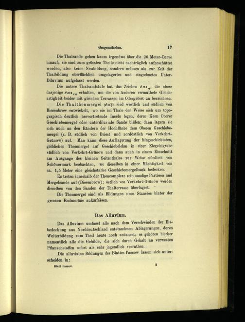 Die Thalthonmergel(öab) sind westlich und südlich von Biesenbrow entwickelt, wo sie im Thale der Welse sich um topograpisch deutlich hervortretende Inseln legen, deren Kern Oberer Geschiebemergel oder unterdiluviale Sande bilden; dann lagern sie sich auch an den Rändern der Hochfläche dem Oberen Geschiebemergel(z. B. südlich von Briest und nordöstlich von VerkehrtGrünow) auf. Man kann diese Auflagerung der feingeschichteten, gelblichen Thonmergel auf Geschiebelehm in einer Ziegeleigrube südlich von Verkehrt-Grünow und dann auch in einem Einschnitt am Ausgange des kleinen Seitenthales zur Welse nördlich von Schönermark beobachten, wo dieselben in einer Mächtigkeit von ca. 1,5 Meter eine gleichstarke Geschiebemergelbank bedecken.