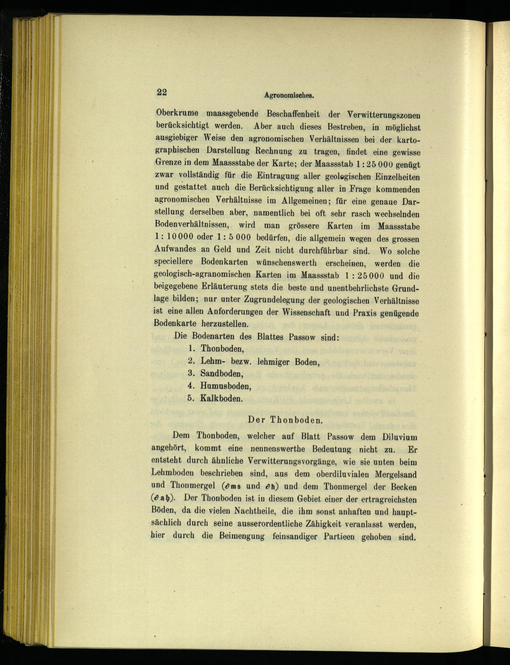 Dem Thonboden, welcher auf Blatt Passow dem Diluvium angehört, kommt eine nennenswerthe Bedeutung nicht zu. Er entsteht durch ähnliche Verwitterungsvorgänge, wie sie unten beim Lehmboden beschrieben sind, aus dem oberdiluvialen Mergelsand und Thonmergel(öms und ön) und dem Thonmergel der Becken (öa%). Der Thonboden ist in diesem Gebiet einer der ertragreichsten Böden, da die vielen Nachtheile, die ihm sonst anhaften und hauptsächlich durch seine ausserordentliche Zähigkeit veranlasst werden, hier durch die Beimengung feinsandiger Partieen gehoben ‚sind,
