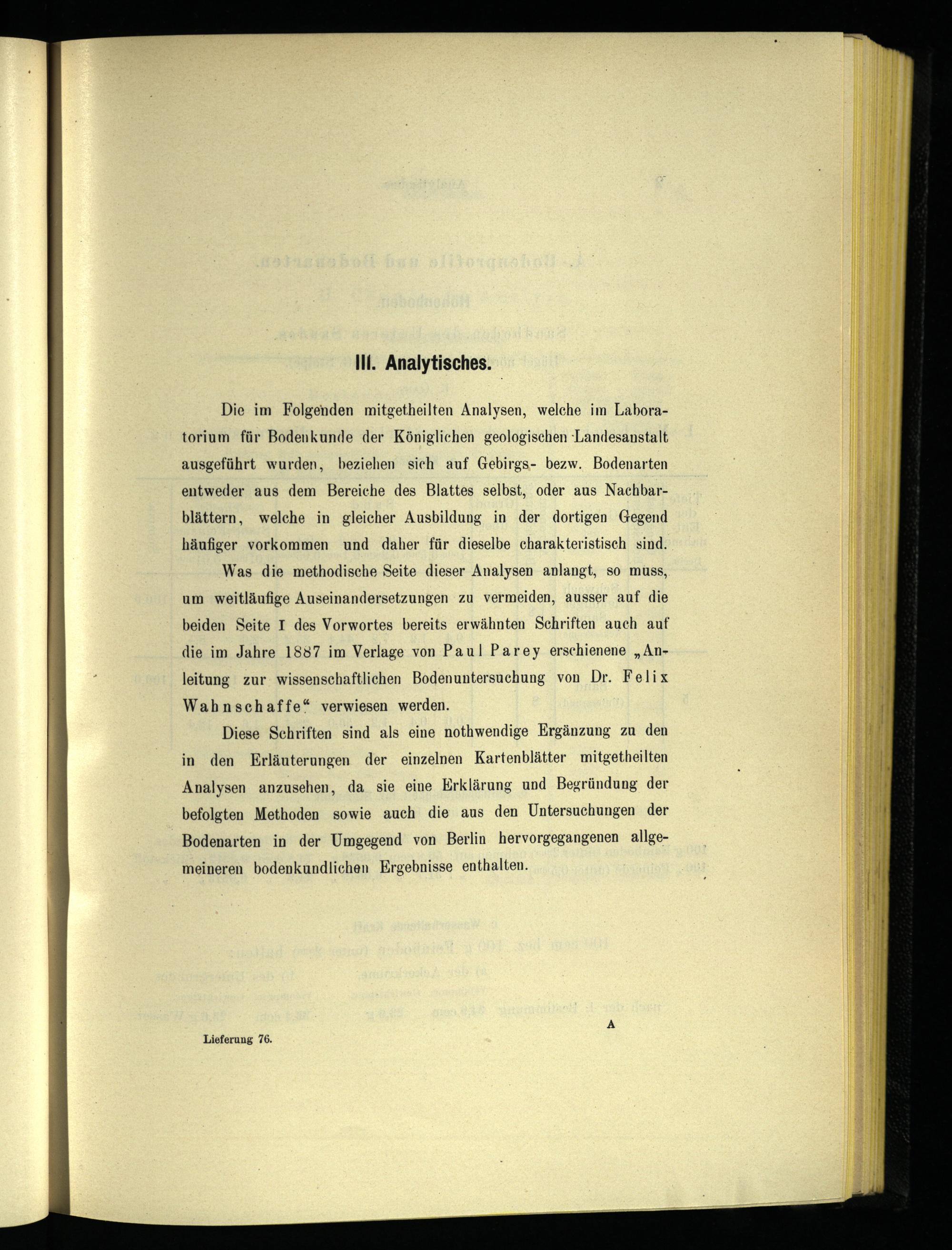 Diese Schriften sind als eine nothwendige Ergänzung zu den in den Erläuterungen der einzelnen Kartenblätter mitgetheilten Analysen anzusehen, da sie eine Erklärung und Begründung der befolgten Methoden sowie auch die aus den Untersuchungen der Bodenarten in der Umgegend von Berlin hervorgegangenen allge