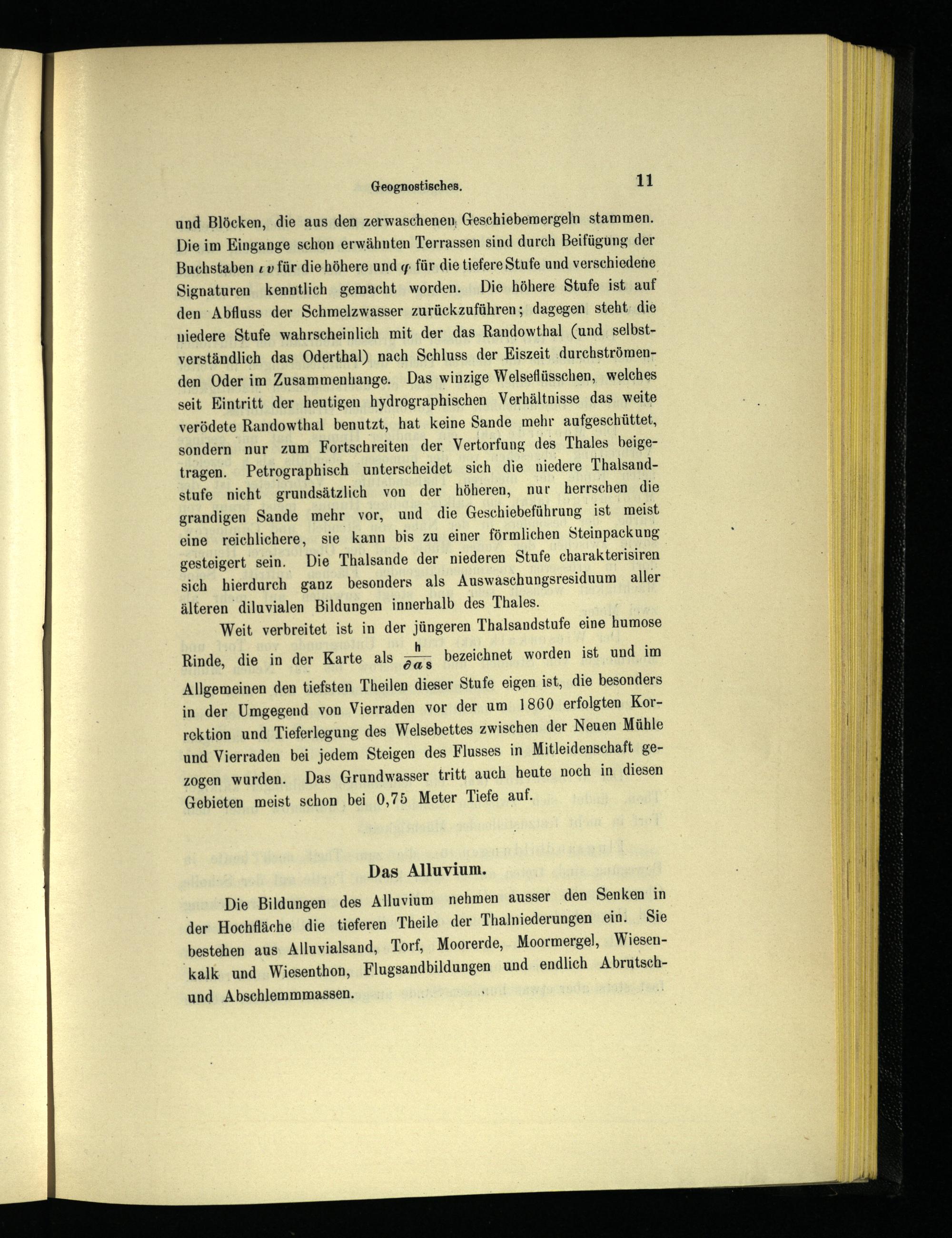 Allgemeinen den tiefsten Theilen dieser Stufe eigen ist, die besonders in der Umgegend von Vierraden vor der um 1860 erfolgten Korrektion und Tieferlegung des Welsebettes zwischen der Neuen Mühle und Vierraden bei jedem Steigen des Flusses in Mitleidenschaft gezogen wurden. Das Grundwasser tritt auch heute noch in diesen Gebieten meist schon bei 0,75 Meter Tiefe auf.