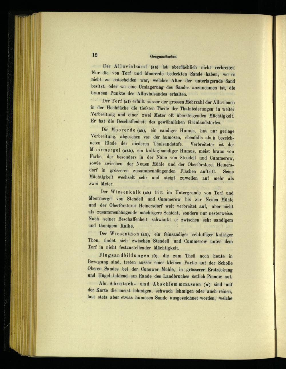 Der Torf(at) erfüllt ausser der grossen Mehrzahl der Alluvionen in der Hochfläche die tiefsten Theile der Thalniederungen‘ in weiter Verbreitung und einer zwei Meter oft übersteigenden Mächtigkeit. Er hat die Beschaffenheit des gewöhnlichen Grünlandstorfes.