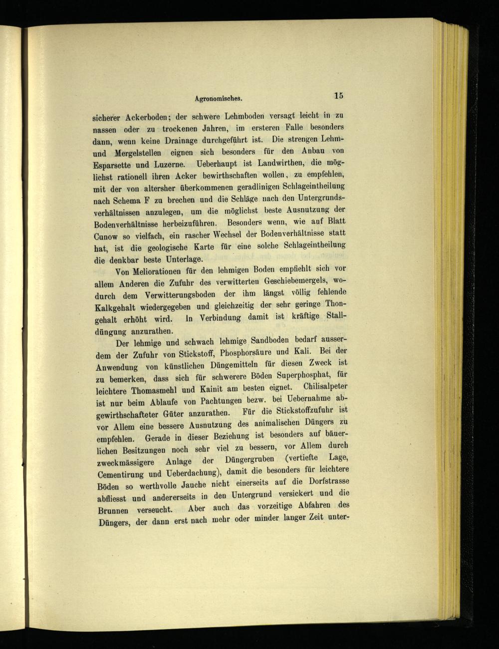 sicherer Ackerboden; der schwere Lehmboden versagt leicht‘ in zu nassen oder zu trockenen Jahren, im ‚ersteren Falle besonders dann, wenn keine Drainage durchgeführt ist. Die strengen Lehmund Mergelstellen eignen sich besonders für den Anbau. von Esparsette und Luzerne. Ueberhaupt ist Landwirthen, die möglichst rationell ihren Acker bewirthschaften wollen, zu empfehlen, mit der von. altersher überkommenen geradlinigen Schlageintheilung nach Schema F zu brechen und die Schläge nach den Untergrundsverhältnissen anzulegen, um die möglichst beste Ausnutzung der Bodenverhältnisse herbeizuführen. Besonders wenn, wie auf Blatt Cunow so vielfach, ein rascher Wechsel der Bodenverhältnisse statt hat, ist die geologische Karte für eine solche Schlageintheilung die denkbar beste Unterlage..