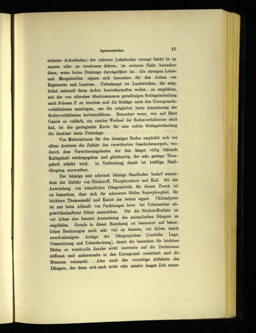 Der lehmige und schwach lehmige Sandboden bedarf ausserdem der Zufuhr von Stickstoff, Phosphorsäure und Kali. Bei der Anwendung von künstlichen Düngemitteln für diesen Zweck ist zu bemerken, dass sich für schwerere Böden Superphosphat, für leichtere Thomasmehl und Kainit am besten eignet. Chilisalpeter ist nur beim Ablaufe von Pachtungen bezw. bei Uebernahme abgewirthschafteter Güter anzurathen. Für die Stickstoffzufuhr ist vor Allem eine bessere Ausnutzung des animalischen Düngers zu empfehlen. Gerade in dieser Beziehung ist besonders auf bäuerlichen Besitzungen noch sehr viel zu bessern, vor Allem durch zweckmässigere Anlage der Düngergruben(vertiefte Lage, Cementirung und UVeberdachung), damit die besonders für leichtere Böden so werthvolle Jauche nicht einerseits auf die Dorfstrasse abfliesst und andererseits in den Untergrund versickert und die Brunnen verseucht. Aber auch. das_ vorzeitige Abfahren ‚des Düngers, der dann erst nach mehr oder minder langer Zeit unter