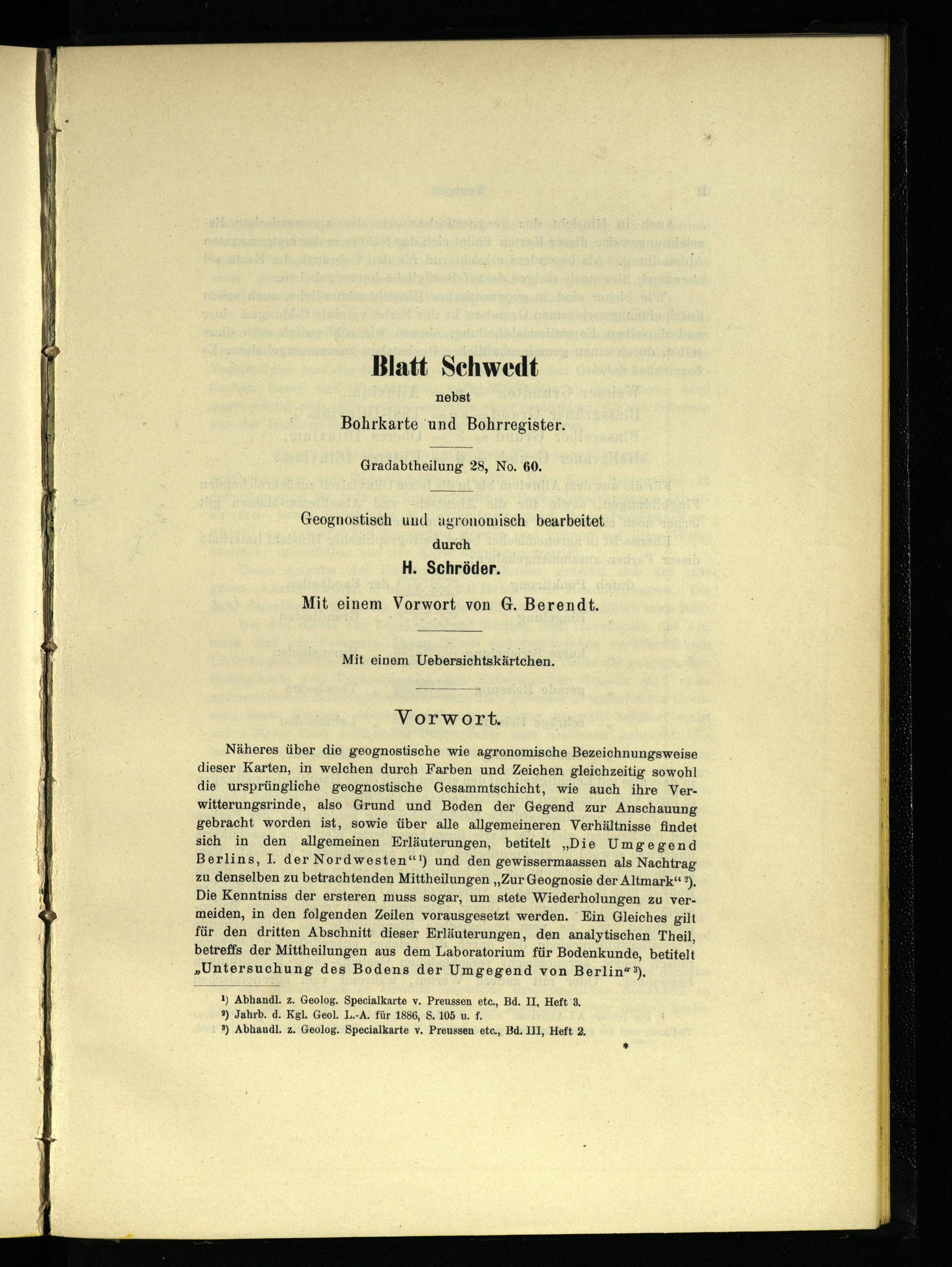 Näheres über die geognostische wie agronomische Bezeichnungsweise dieser Karten, in welchen durch Farben und Zeichen gleichzeitig sowohl die ursprüngliche geognostische Gesammtschicht, wie auch ihre Verwitterungsrinde, also Grund und Boden der Gegend zur Anschauung gebracht worden ist, sowie über alle allgemeineren Verhältnisse findet sich in den allgemeinen Erläuterungen, betitelt„Die Umgegend Berlins , I. der Nordwesten‘') und den gewissermaassen als Nachtrag zu denselben zu betrachtenden Mittheilungen„Zur Geognosie der Altmark “ 9. Die Kenntniss der ersteren muss sogar, um stete Wiederholungen zu vermeiden, in den folgenden Zeilen vorausgesetzt werden. Ein Gleiches gilt für den dritten Abschnitt dieser Erläuterungen, den analytischen Theil, betreffs der Mittheilungen aus dem Laboratorium für Bodenkunde, betitelt „Untersuchung des Bodens der Umgegend von Berlin “ 9.