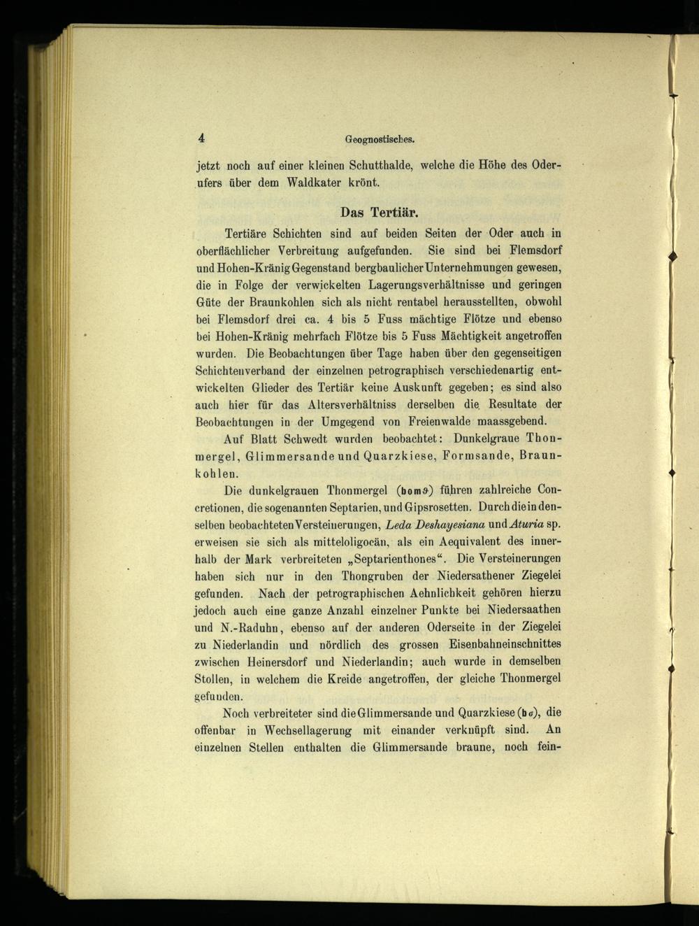 Die dunkelgrauen Thonmergel(bomg) führen zahlreiche Coneretionen, die sogenannten Septarien, und Gipsrosetten. Durch diein denselben beobachteten Versteinerungen, Leda Deshayesiana und Aturia Sp. erweisen sie sich als mitteloligocän, als ein Aequivalent des innerhalb der Mark verbreiteten„Septarienthones“. Die Versteinerungen haben sich nur in den Thongruben der Niedersathener Ziegelei gefunden. Nach ‚der petrographischen Aehnlichkeit gehören hierzu jedoch auch eine ganze Anzahl einzelner Punkte bei Niedersaathen und N.-Raduhn, ebenso auf. der. anderen Oderseite in der Ziegelei zu Niederlandin und nördlich des grossen Kisenbahneinschnittes zwischen Heinersdorf und Niederlandin; auch wurde in demselben Stollen, in welchem die Kreide angetroffen, der gleiche Thonmergel gefunden.