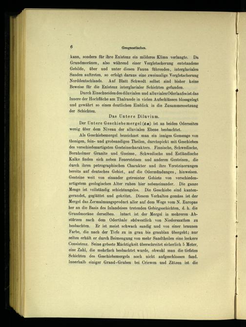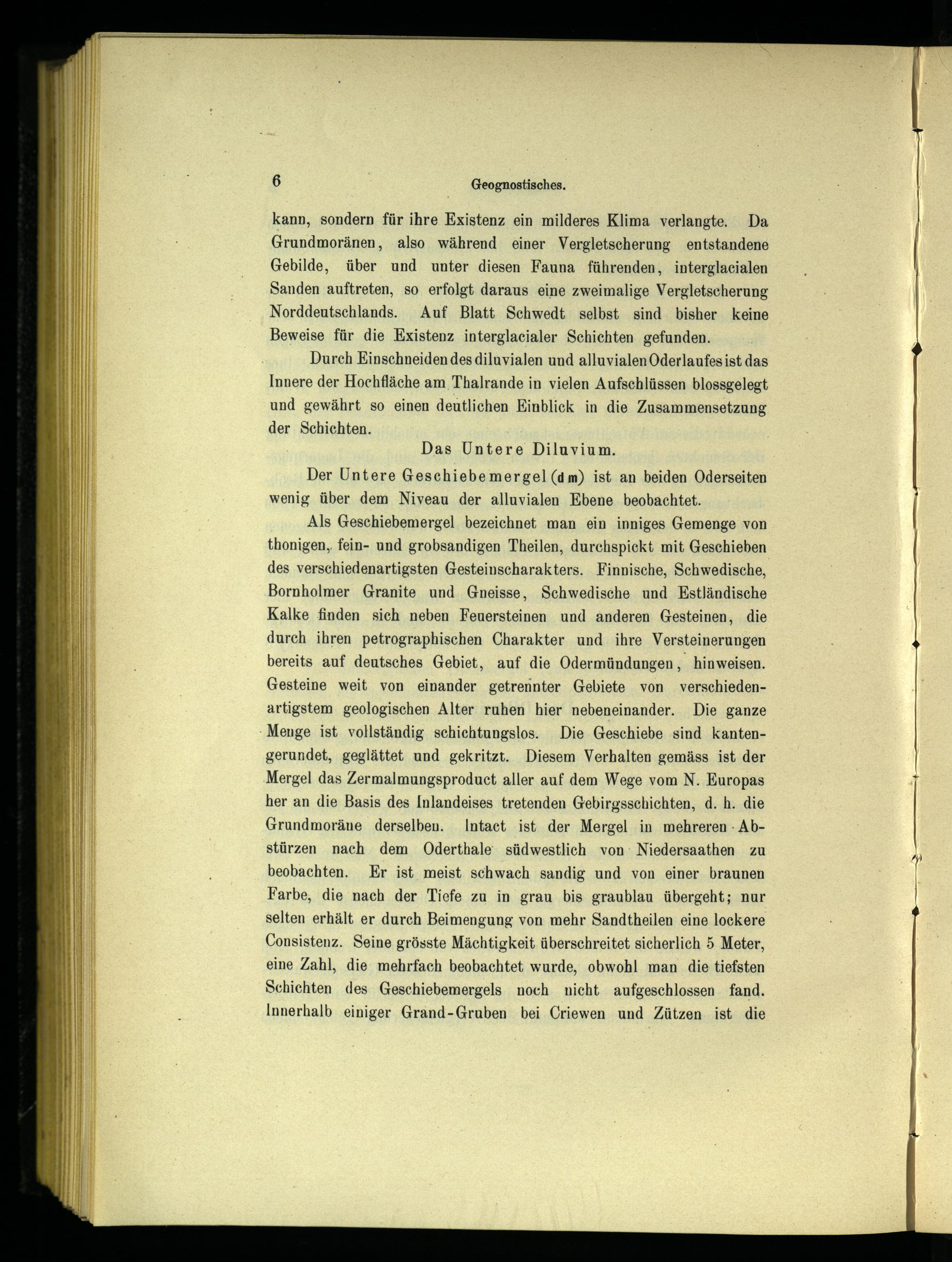 Als Geschiebemergel bezeichnet man ein inniges Gemenge von thonigen,. fein- und grobsandigen Theilen, durchspiekt mit Geschieben des verschiedenartigsten Gesteinscharakters. Finnische, Schwedische, Bornholmer Granite und Gmneisse, Schwedische und Estländische Kalke finden sich neben Feuersteinen und anderen Gesteinen, die durch ihren petrographischen Charakter und ihre Versteinerungen bereits auf deutsches Gebiet, auf die Odermündungen, hinweisen. Gesteine weit von einander getrennter Gebiete von verschiedenartigstem geologischen Alter ruhen hier nebeneinander. Die ganze Menge ist vollständig schichtungslos. Die Geschiebe sind kantengerundet, geglättet und gekritzt. Diesem Verhalten gemäss ist der Mergel das Zermalmungsproduct aller auf dem Wege vom N. Europas her an die Basis des Inlandeises tretenden Gebirgsschichten, d. h. die Grundmoräne derselben. Intact ist der Mergel in mehreren+ Abstürzen nach dem Oderthale südwestlich von: Niedersaathen zu beobachten. Er ist meist schwach sandig und von einer braunen Farbe, die nach der Tiefe zu in grau bis graublau übergeht; nur selten erhält er durch Beimengung von mehr Sandtheilen eine lockere Consistenz. Seine grösste Mächtigkeit überschreitet sicherlich 5 Meter, eine Zahl, die mehrfach beobachtet wurde, obwohl man die tiefsten Schichten des Geschiebemergels noch nicht aufgeschlossen fand. Innerhalb einiger Grand-Gruben bei Criewen und Zützen ist die