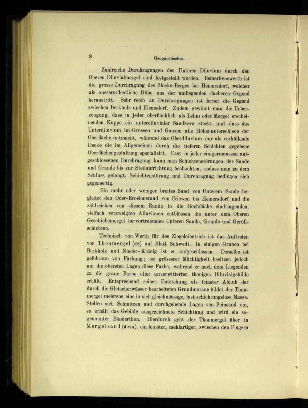 Technisch von Werth, für den Ziegeleibetrieb ist das Auftreten von Thonmergel(dh) auf Blatt Schwedt . In einigen Gruben bei Berkholz und Nieder-Kränig ist er aufgeschlossen. Derselbe ist gelbbraun von Färbung; bei grösserer Mächtigkeit besitzen jedoch nur die obersten Lagen diese Farbe, während er nach dem Liegenden zu die graue Farbe aller unverwitterten thonigen Diluvialgebilde erhält. Entsprechend seiner Entstehung als feinster Abhub der durch die Gletscherwässer bearbeiteten Grundmoräne bildet der Thonmergel meistens eine in sich gleichmässige, fast schichtungslose Masse. Stellen sich Schmitzen und durchgehende Lagen von Feinsand ein, so erhält das Gebilde ausgezeichnete Schichtung und wird ein sogenannter Bänderthon. Hierdurch geht der Thonmergel über in Mergelsand(dm s), ein feinster, mehlartiger, zwischen den Fingern