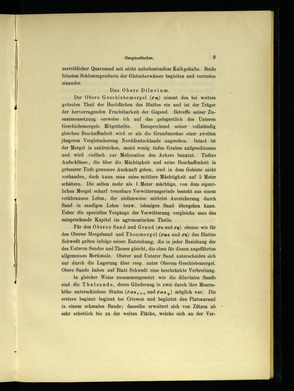 Der Obere Geschiebemergel(m) nimmt den bei weitem grössten Theil der Hochflächen des Blattes ein und ist der Träger der hervorragenden Fruchtbarkeit der Gegend. Betreffs seiner Zusammensetzung verweise ich auf das gelegentlich des Unteren Geschiebemergels Mitgetheilte. Entsprechend seiner vollständig gleichen Beschaffenheit wird er als die Grundmoräne einer zweiten jüngeren Vergletscherung Norddeutschlands angesehen. Intact ist der Mergel in zahlreichen, meist wenig tiefen Gruben aufgeschlossen und wird ‚vielfach zur Melioration des Ackers benutzt. Tiefere Aufschlüsse, die über die Mächtigkeit und seine Beschaffenheit in grösserer Tiefe genauere Auskunft geben, sind in dem Gebiete nicht vorhanden, doch kann man seine mittlere Mächtigkeit auf 5 Meter schätzen. Die selten mehr als 1 Meter mächtige, von dem. eigentlichen Mergel scharf trennbare Verwitterungsrinde besteht aus einem rothbraunen Lehm, der stellenweise mittelst Anreicherung durch Sand in sandigen Lehm bezw. lehmigen Sand übergehen kann: Ueber die speciellen Vorgänge der Verwitterung vergleiche man das entsprechende Kapitel im agronomischen Theile.