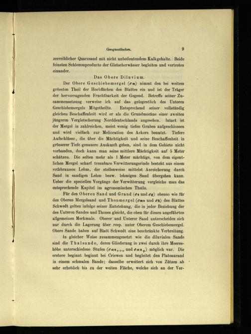 Für den Oberen Sand und Grand(ös und ög) ebenso wie für den Oberen Mergelsand und Thonmergel(öms und ön) des Blattes Schwedt gelten infolge seiner Entstehung, die in jeder Beziehung der des Unteren Sandes und Thones gleicht, die oben für diesen angeführten allgemeinen Merkmale. Oberer’und Unterer Sand unterscheiden sich nur durch die Lagerung über resp. unter Oberem Geschiebemergel. Obere Sande haben auf Blatt Schwedt eine beschränkte Verbreitung.
