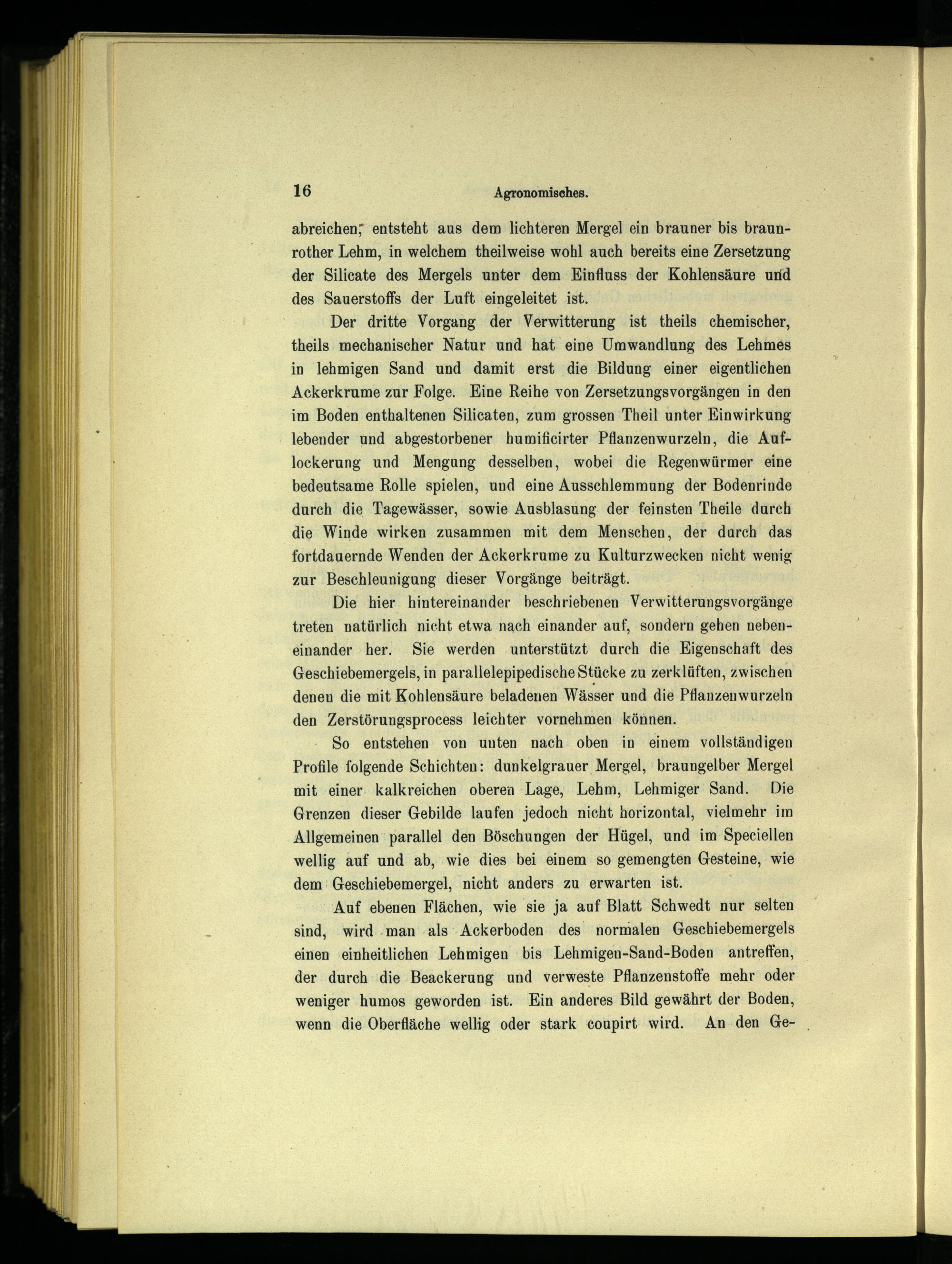 Der dritte Vorgang der Verwitterung ist theils chemischer, theils mechanischer Natur und hat eine Umwandlung des Lehmes in lehmigen Sand und damit erst die Bildung einer eigentlichen Ackerkrume zur Folge. Eine Reihe von Zersetzungsvorgängen in den im Boden enthaltenen Silicaten, zum grossen Theil unter Einwirkung lebender und abgestorbener humifieirter Pflanzenwurzeln, die Auflockerung und Mengung desselben, wobei die Regenwürmer eine bedeutsame Rolle spielen, und eine Ausschlemmung der Bodenrinde durch die Tagewässer, sowie Ausblasung. der feinsten Theile durch die Winde wirken zusammen mit dem Menschen, der durch das fortdauernde Wenden der Ackerkrume zu Kulturzwecken nicht wenig zur Beschleunigung dieser Vorgänge beiträgt.