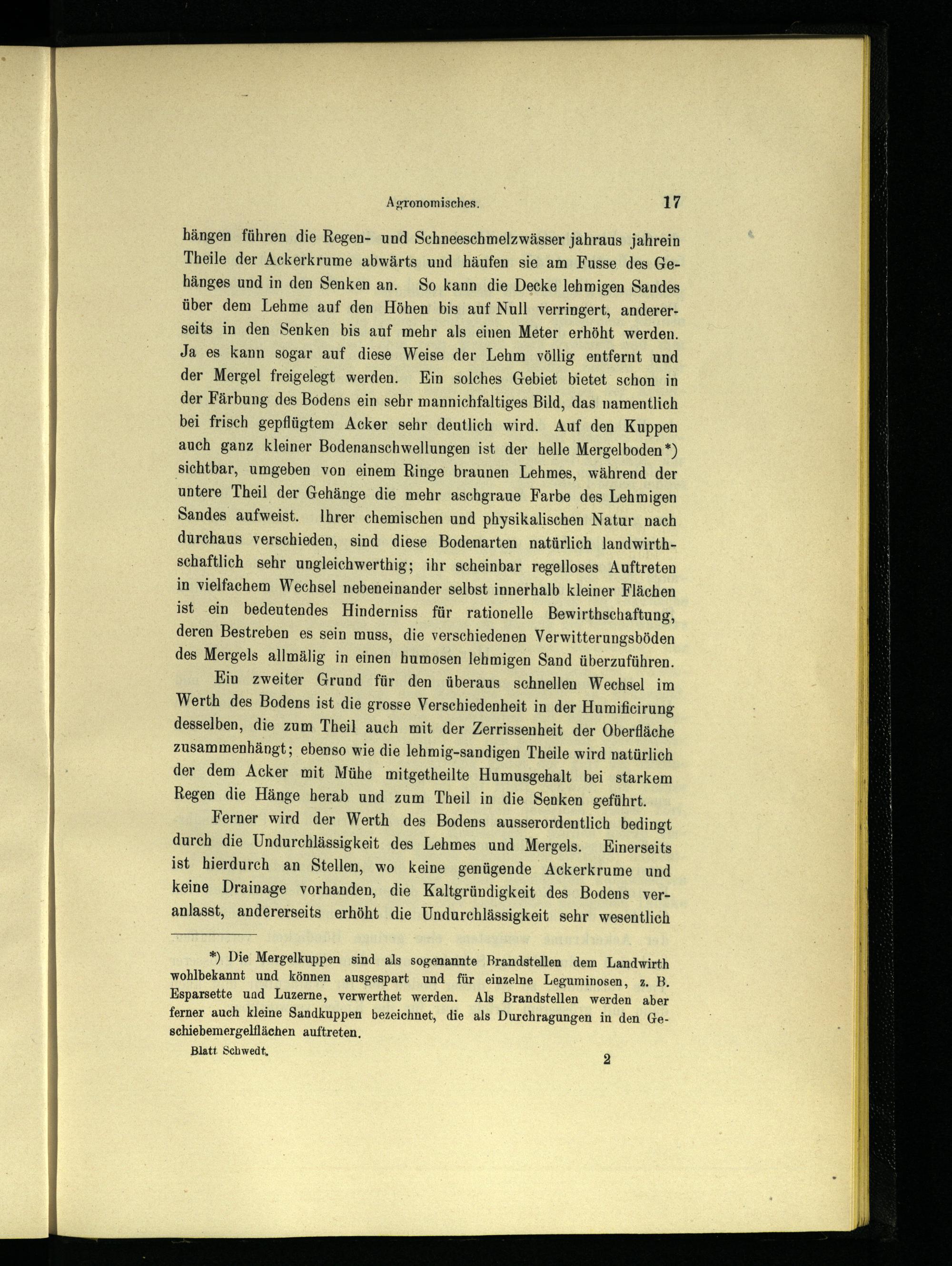 hängen führen die Regen- und Schneeschmelzwässer jahraus jahrein Theile der Ackerkrume abwärts und häufen sie am Fusse des Gehänges und in den Senken an. So kann die Decke lehmigen Sandes über dem Lehme auf den Höhen bis auf Null verringert, andererseits in den Senken bis auf mehr als einen Meter erhöht werden. Ja es kann sogar auf diese Weise der Lehm völlig entfernt und der Mergel freigelegt werden. Ein solches Gebiet bietet schon in der Färbung des Bodens ein sehr mannichfaltiges Bild, das namentlich bei frisch gepflügtem Acker sehr deutlich wird. Auf den Kuppen auch ganz kleiner Bodenanschwellungen ist der helle Mergelboden*) sichtbar, umgeben von einem Ringe braunen Lehmes, während der untere Theil der Gehänge die mehr aschgraue Farbe des Lehmigen Sandes aufweist. Ihrer chemischen und physikalischen Natur nach durchaus verschieden, sind diese Bodenarten natürlich landwirthschaftlich sehr ungleichwerthig; ihr scheinbar regelloses Auftreten in vielfachem Wechsel nebeneinander selbst innerhalb kleiner Flächen ist ein bedeutendes Hinderniss für rationelle Bewirthschaftung, deren Bestreben es sein muss, die verschiedenen Verwitterungsböden des Mergels allmälig in einen humosen lehmigen Sand überzuführen. Ein zweiter Grund für den überaus schnellen Wechsel im Werth des Bodens ist die grosse Verschiedenheit in der Humificirung desselben, die zum Theil auch mit der Zerrissenheit der Oberfläche zusammenhängt; ebenso wie die lehmig-sandigen Theile wird natürlich der dem Acker mit Mühe mitgetheilte Humusgehalt bei starkem Regen die Hänge herab und zum Theil in die Senken geführt. Ferner wird der Werth des Bodens ausserordentlich bedingt durch die Undurchlässigkeit des Lehmes und Mergels. Einerseits ist hierdurch an Stellen, wo keine genügende Ackerkrume und keine Drainage vorhanden, die Kaltgründigkeit des Bodens veranlasst, andererseits erhöht die Undurchlässigkeit sehr wesentlich